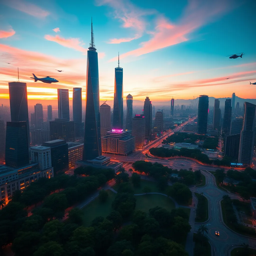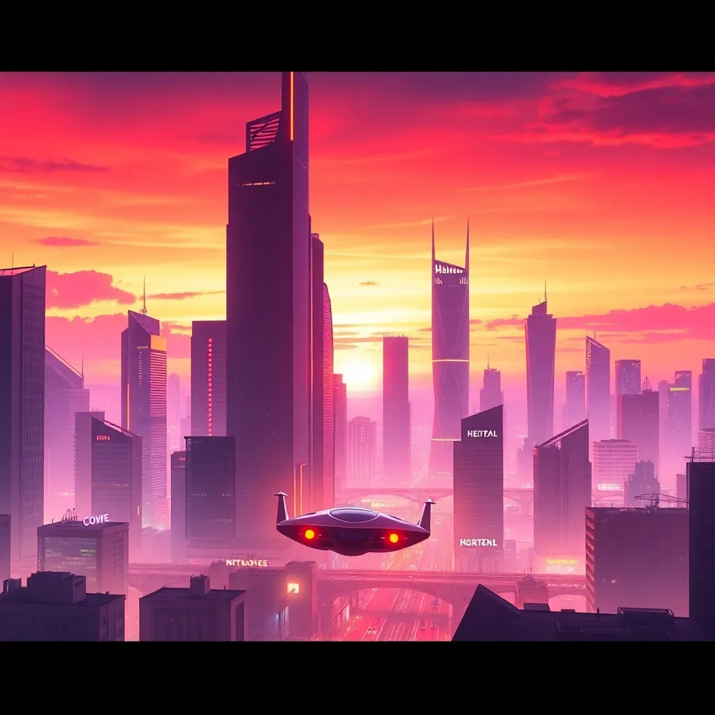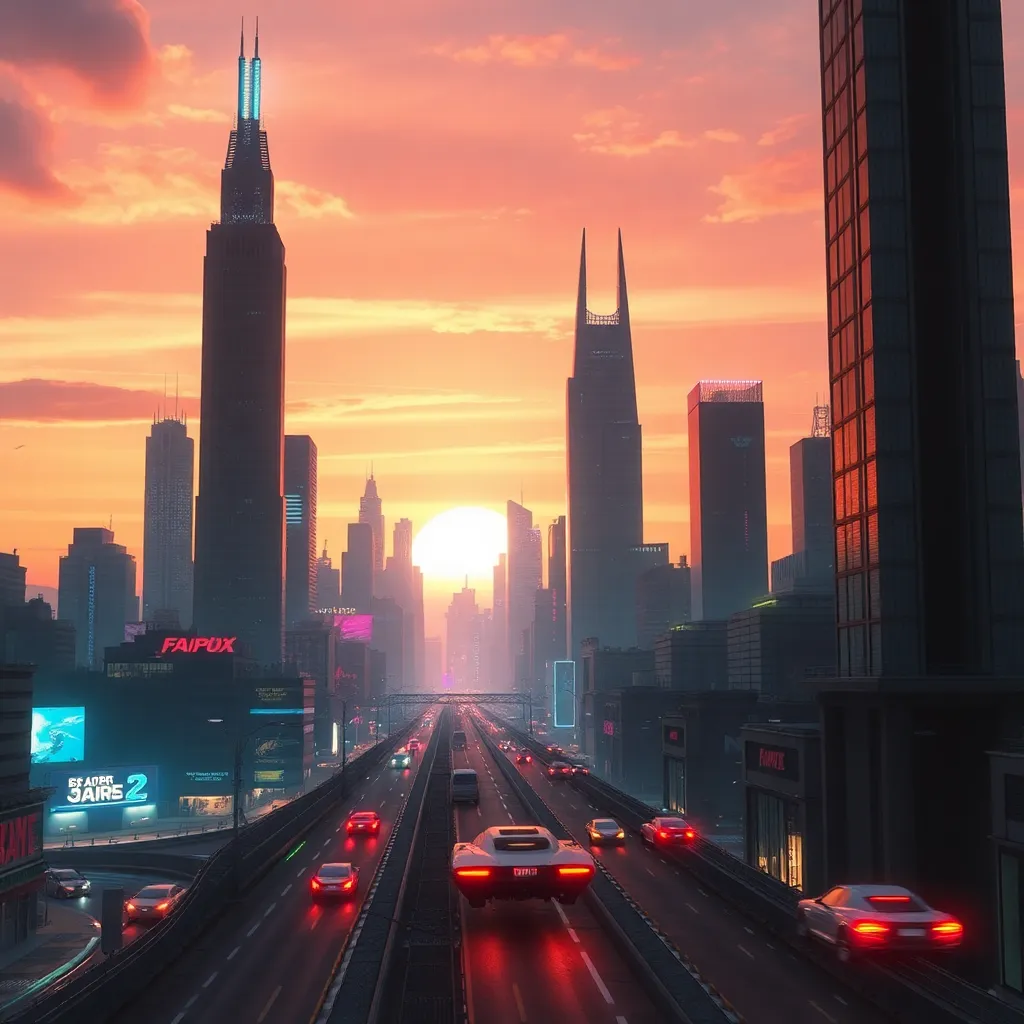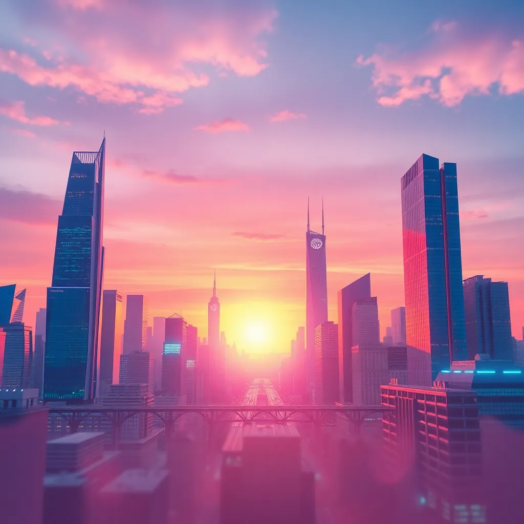 Create an AI-generated image of a futuristic cityscape at sunset, with towering skyscrapers and sleek architecture. Incorporate vibrant colors, subtle neon lights, and a sense of movement and energy. The image should evoke a sense of optimism and innovation, as if the city is a beacon of progress and possibility.