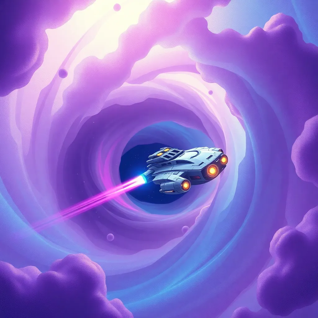 Create an AI-generated illustration for the 'Galactic Odyssey' chapter in the AI Yearbook. Depict a futuristic spacecraft, 'Aurora's Hope', soaring through a swirling vortex of purple and blue gases, surrounded by a halo of shimmering stars. Incorporate subtle textures and glowing accents to convey a sense of adventure and discovery.