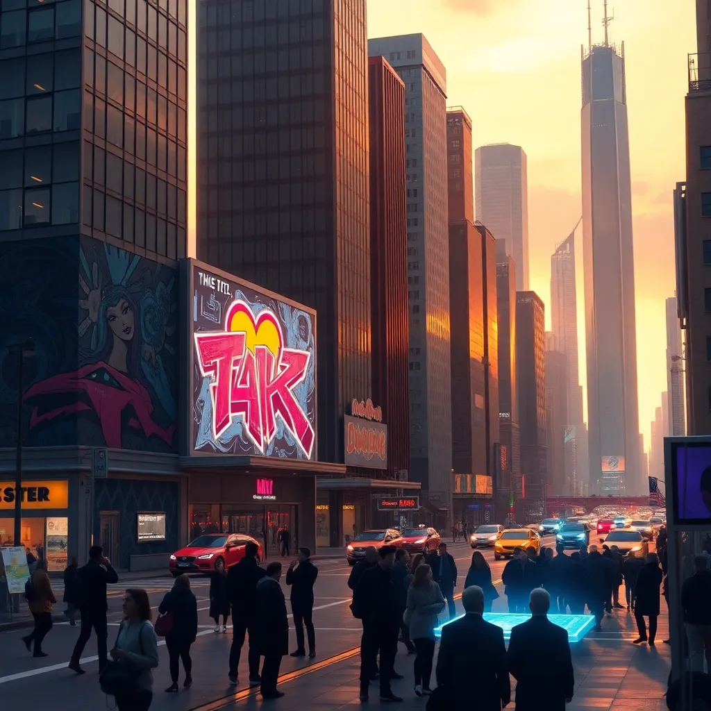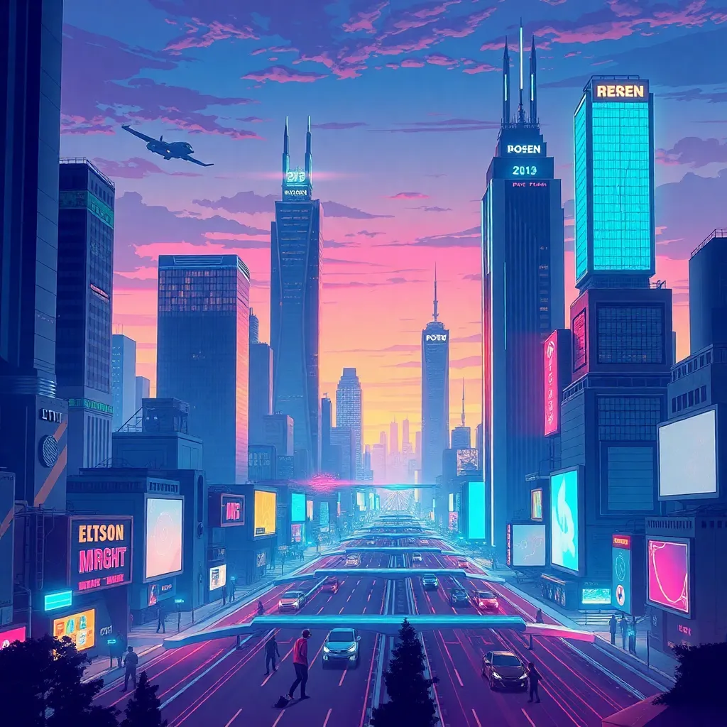 Imagine a futuristic cityscape at sunset, with sleek skyscrapers and flying cars zipping by. In the center, a large digital clock tower glows with a neon blue light, surrounded by a sprawling metropolis with towering robots and holographic advertisements. The sky is painted with hues of orange and pink.
