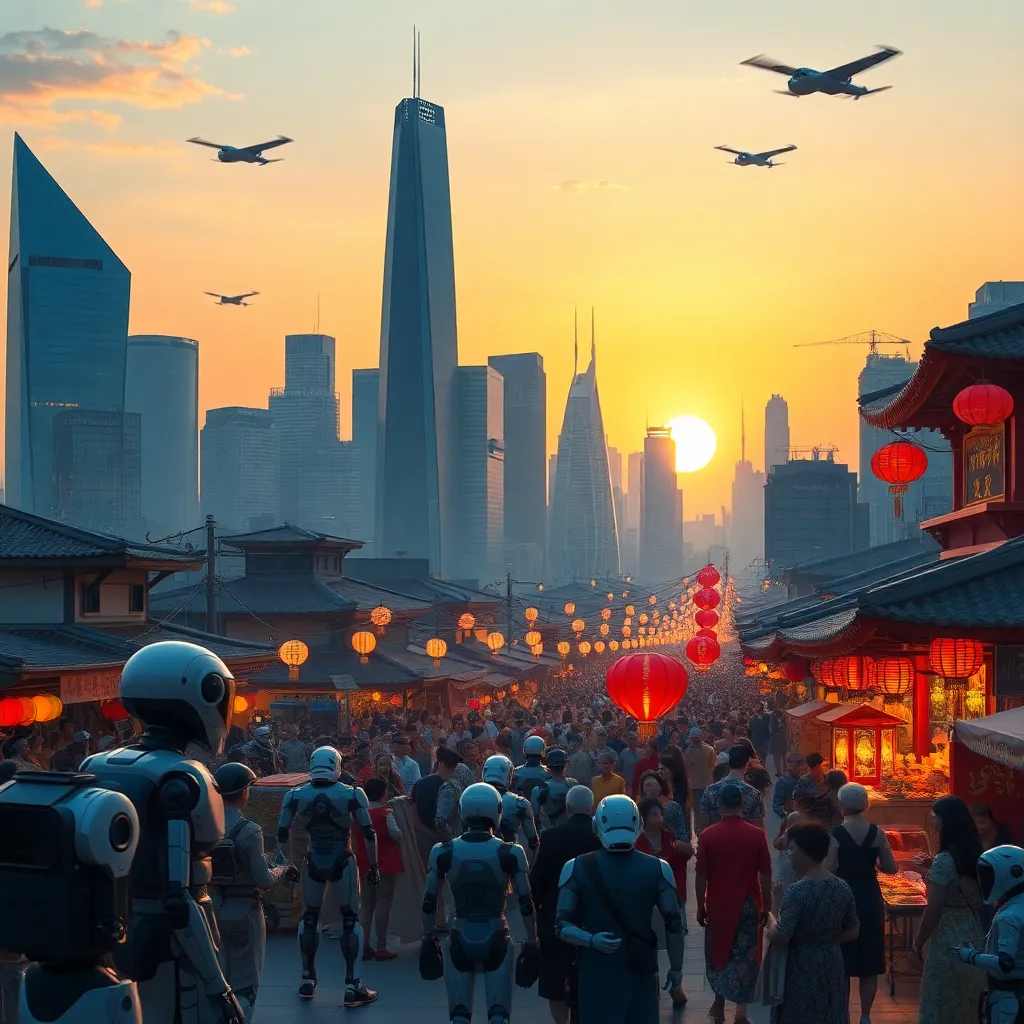 Imagine a futuristic cityscape at sunset, with sleek skyscrapers and flying cars zipping by. In the foreground, a group of robots and humans from different cultures and backgrounds gather to celebrate a vibrant cultural festival, surrounded by colorful lanterns, street food, and lively music. Generate an AI image that captures this scene.