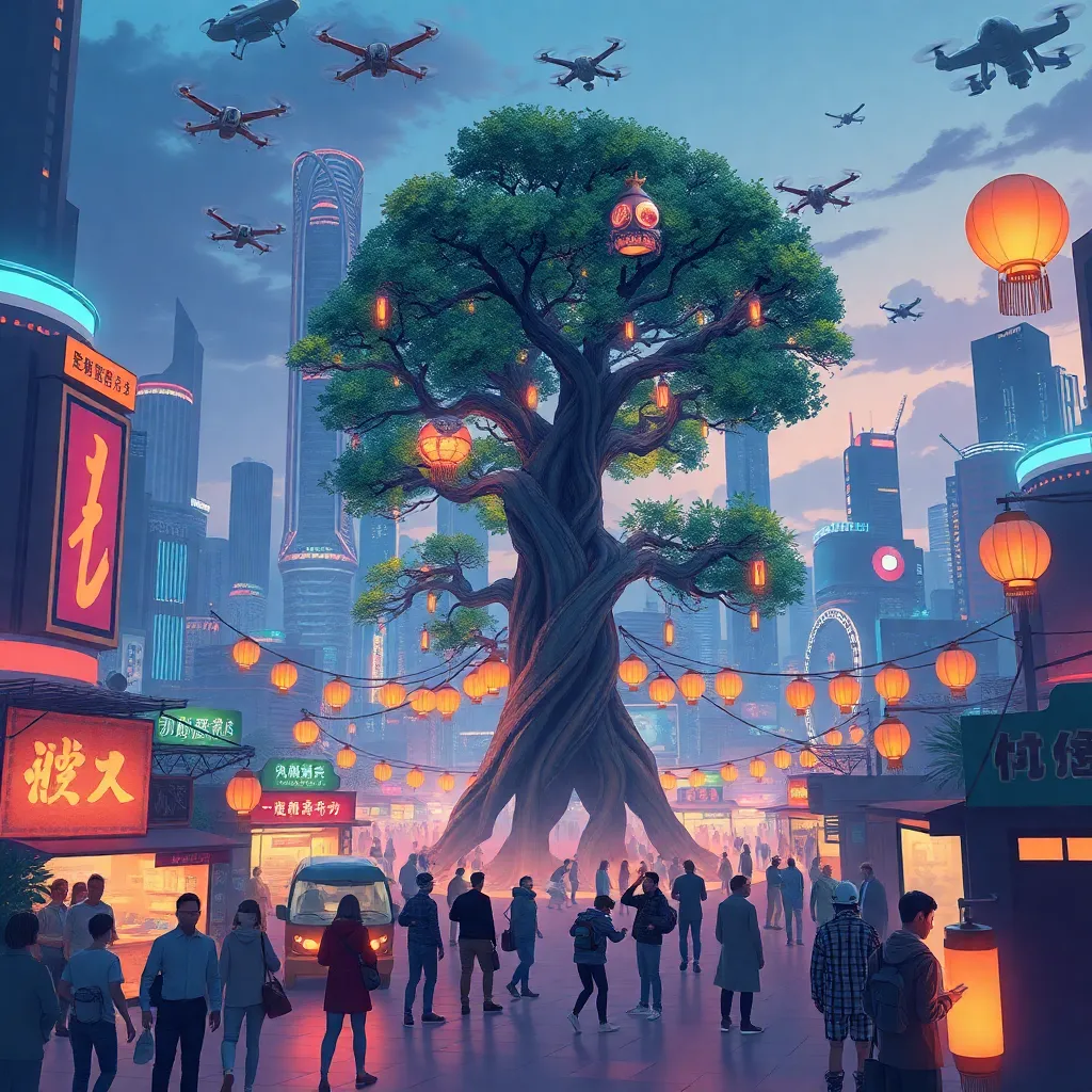 Create a futuristic illustration of a bustling metropolis at dusk, with towering skyscrapers, neon lights, and flying drones. Incorporate a giant, glowing tree in the center, surrounded by humans and robots enjoying a vibrant night market. Add a touch of whimsy with floating lanterns and a hint of magic in the air.