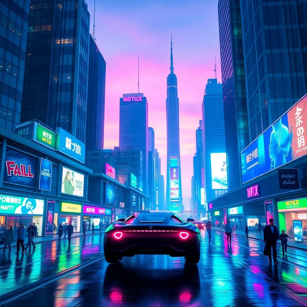 Create a futuristic cityscape at dusk, with towering skyscrapers and neon lights reflecting off the wet pavement. Incorporate a flying car hovering above the streets, surrounded by holographic advertisements and bustling pedestrians. Use a vibrant color palette with shades of blue, green, and purple to capture the city's energetic atmosphere.