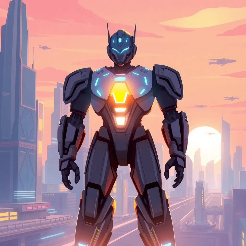 Create an illustration of a futuristic cityscape at sunrise, with sleek skyscrapers, flying cars, and a vibrant atmosphere. Incorporate a majestic robot standing tall in the foreground, with glowing blue circuits and a warm, golden light emanating from its chest. The background should be a blend of soft pinks, oranges, and purples.