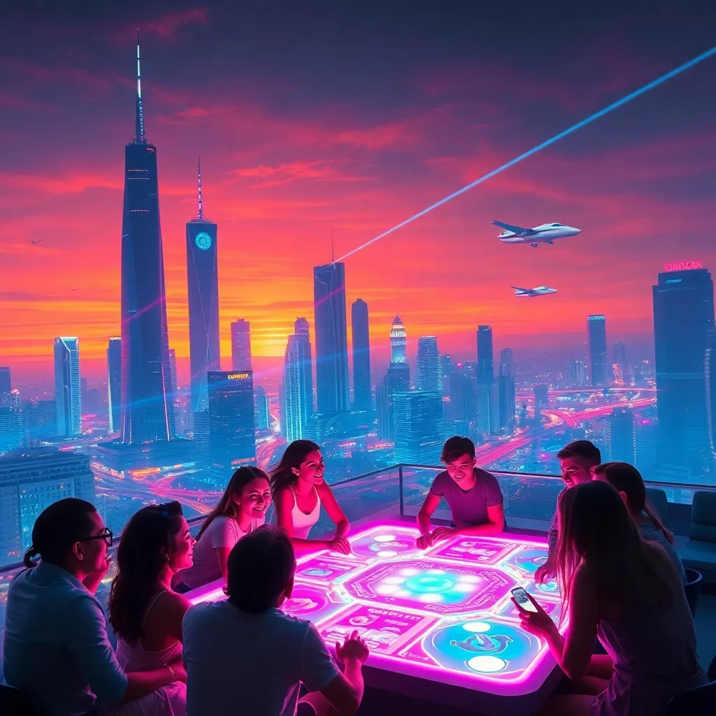 Imagine a futuristic cityscape at sunset, with towering skyscrapers and sleek flying cars zipping by. In the foreground, a group of friends are gathered around a holographic table, laughing and playing a virtual game. The atmosphere is vibrant and lively, with neon lights and laser beams illuminating the night sky.