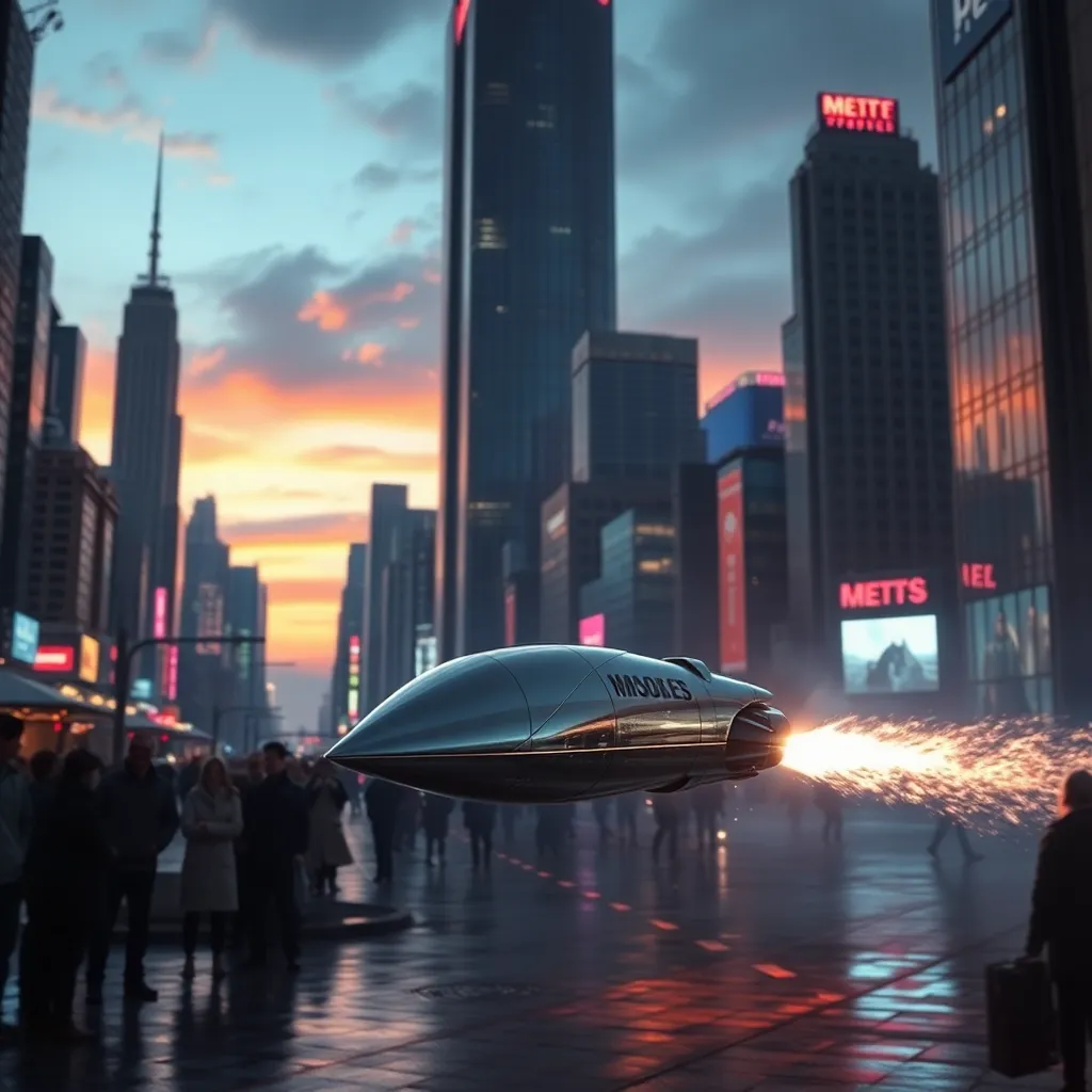Imagine a futuristic cityscape at dusk, with towering skyscrapers and neon lights reflecting off the wet pavement. In the foreground, a sleek, silver bullet-shaped spacecraft descends from the sky, leaving a trail of sparks and smoke. The city's inhabitants gather around, marveling at the arrival of extraterrestrial visitors.