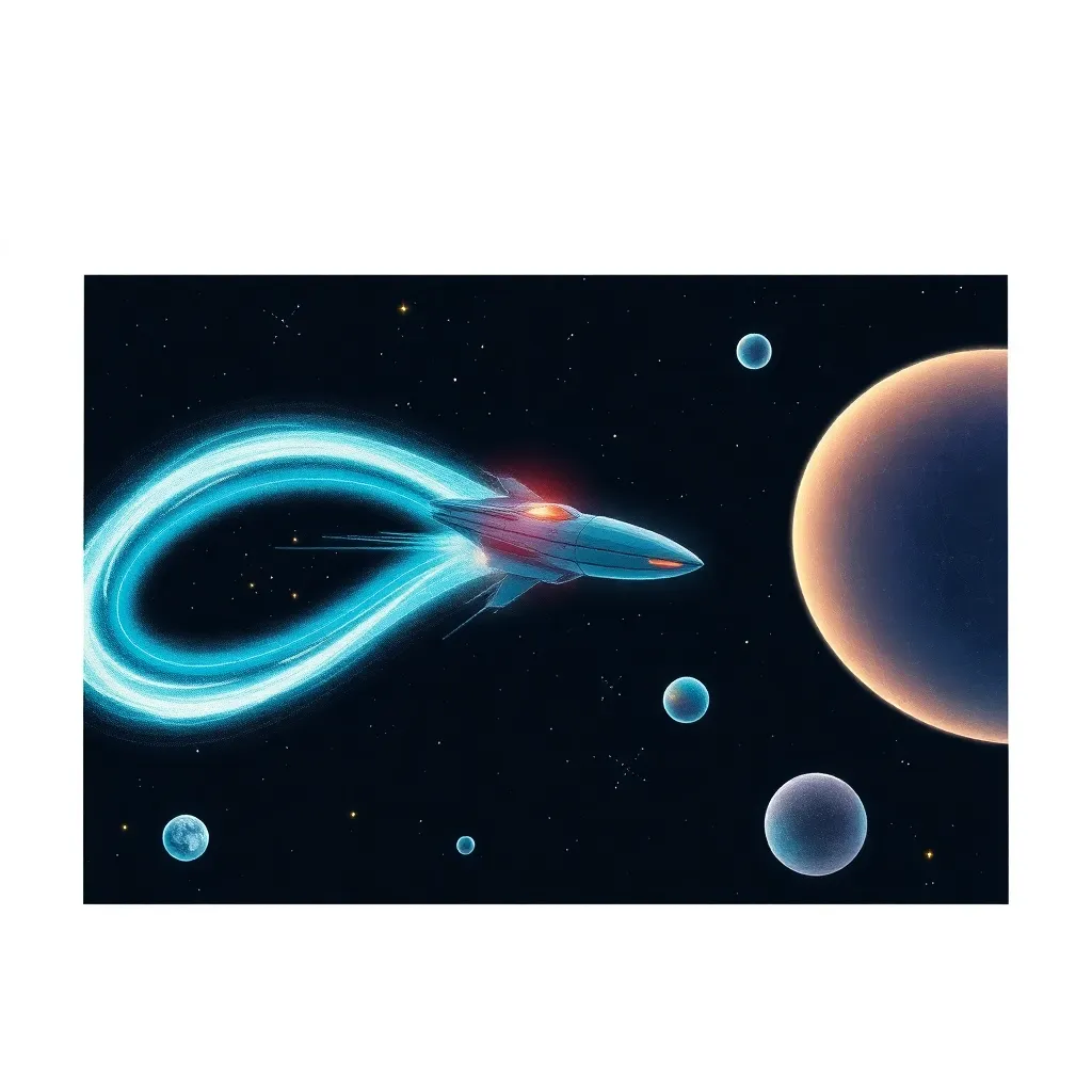 Create an illustration for the 'Future of Space Exploration' page in the AI Yearbook. Depict a futuristic spacecraft with a glowing aurora-like trail, surrounded by stars and planets. Incorporate AI-generated elements, such as swirling digital patterns and glowing circuitry, to convey the intersection of technology and space travel.