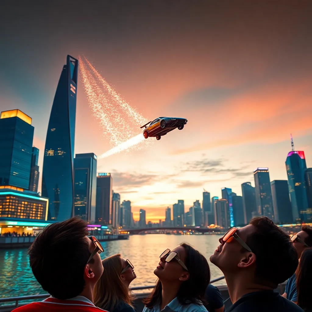 Imagine a futuristic cityscape at sunset, with towering skyscrapers and flying cars zipping by. In the foreground, a group of people from diverse backgrounds are gathered around a holographic display, laughing and cheering as they celebrate a groundbreaking AI discovery. Generate an image that captures the excitement and innovation.