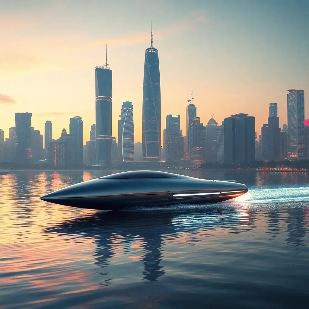 Imagine a futuristic cityscape at dusk, with towering skyscrapers and neon lights reflecting off a serene lake. In the foreground, a sleek, silver bullet-shaped hovercraft glides across the water, leaving a trail of iridescent sparks in its wake. Generate an AI image that captures this mesmerizing scene.