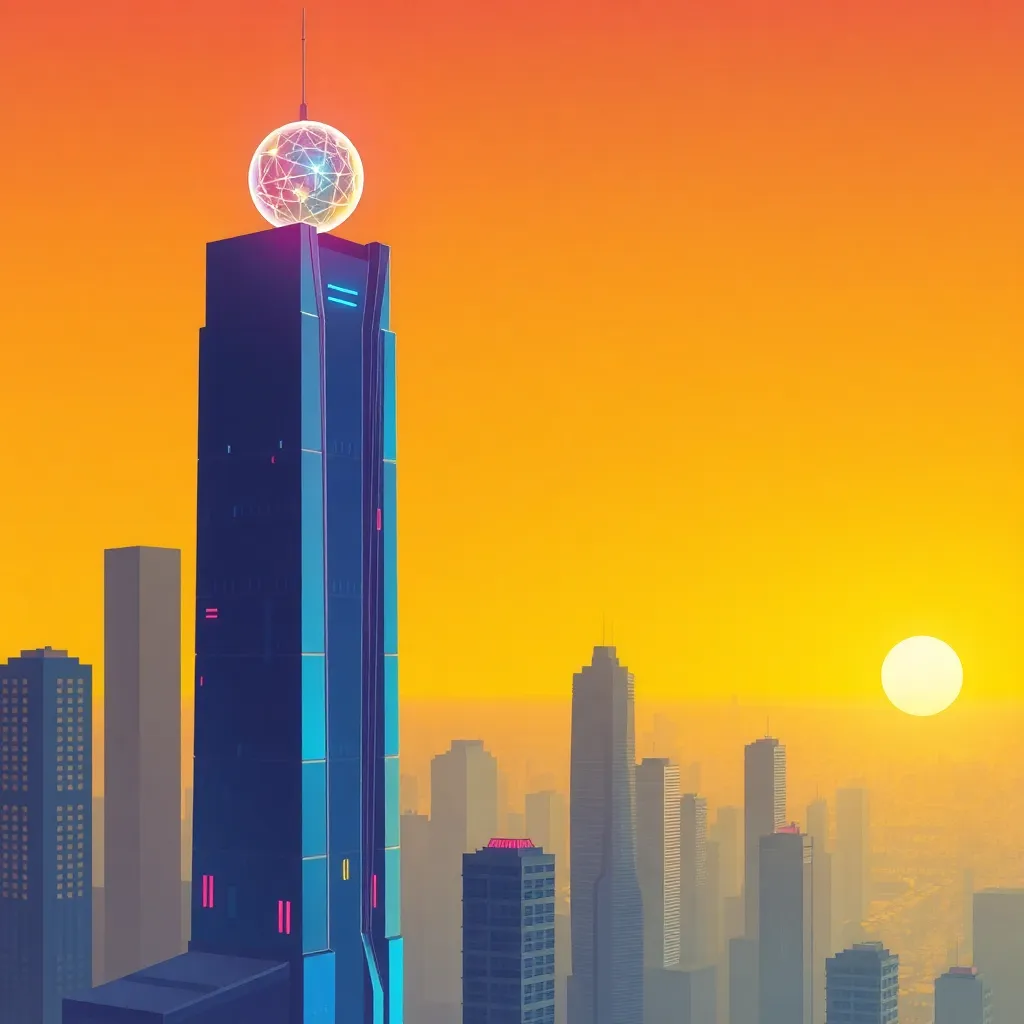Create an illustration for a futuristic cityscape at sunset, featuring a towering skyscraper with a glowing AI-powered orb on its rooftop. Incorporate vibrant colors and abstract shapes to convey a sense of innovation and technology. The background should be a warm, golden hue with a subtle cityscape in the distance.
