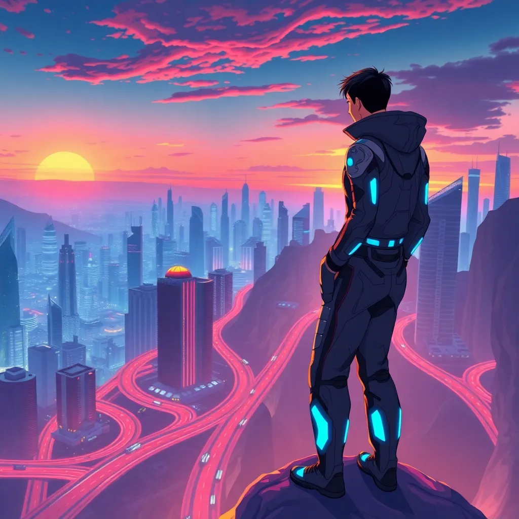 Create a futuristic illustration of a person standing on a cliff overlooking a cityscape at sunset. The person is dressed in a sleek, high-tech jumpsuit with glowing blue accents. The city is a marvel of modern architecture, with towering skyscrapers and flying cars zipping by. Incorporate vibrant colors and dynamic lighting.