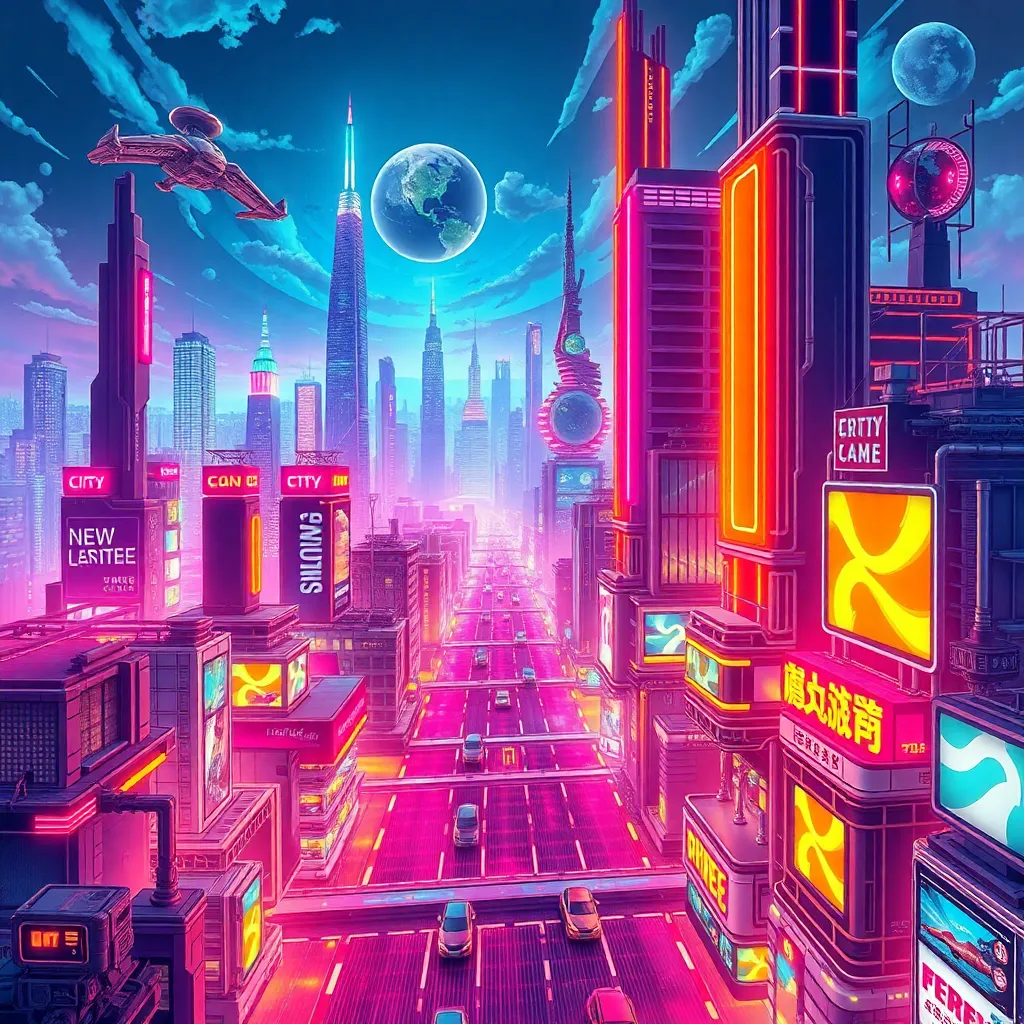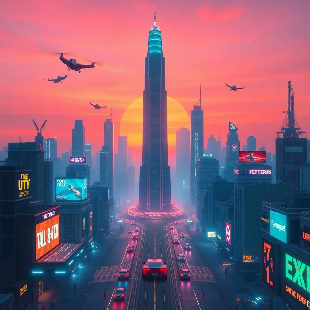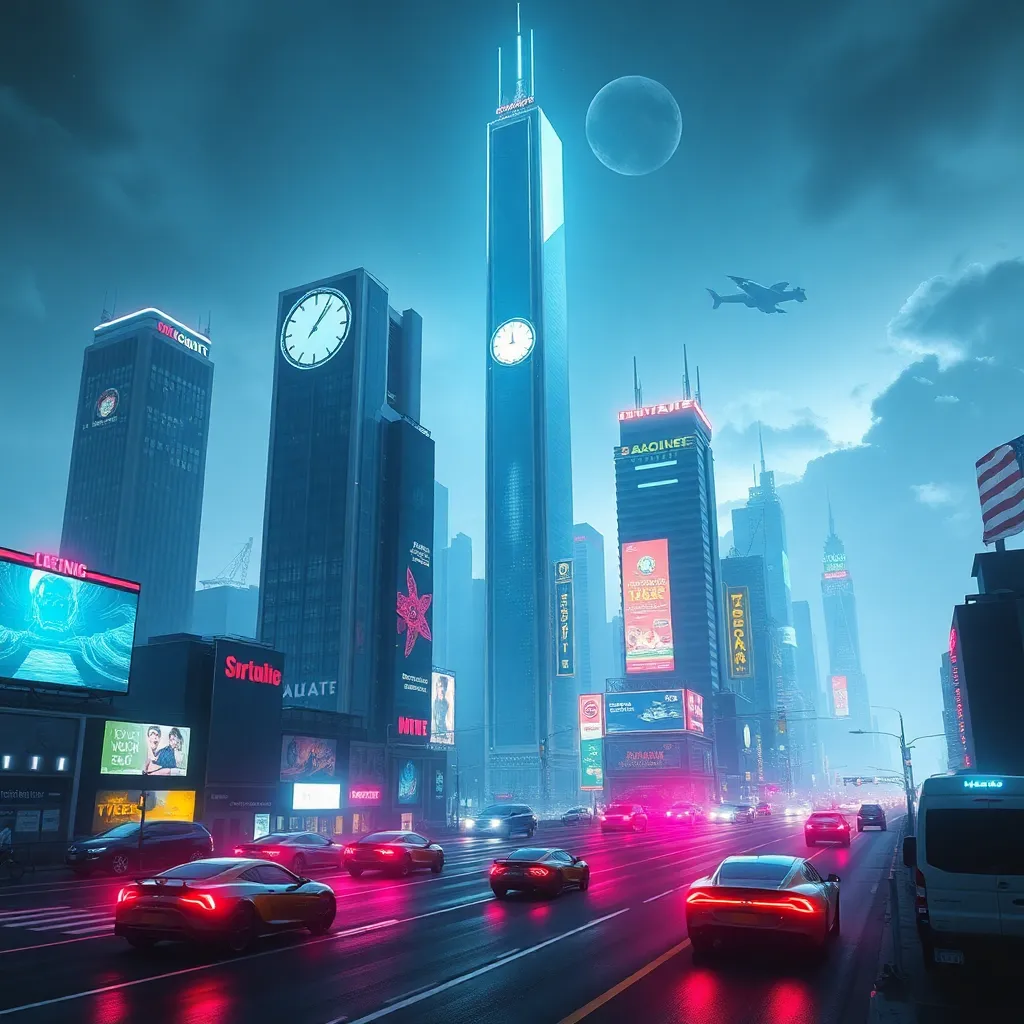 Create a futuristic cityscape with a sleek, high-tech skyscraper in the center, surrounded by flying cars and hoverbikes zipping by. Incorporate neon lights and holographic advertisements, with a giant digital clock tower looming in the background. The atmosphere should be vibrant and energetic, with a hint of nostalgia.