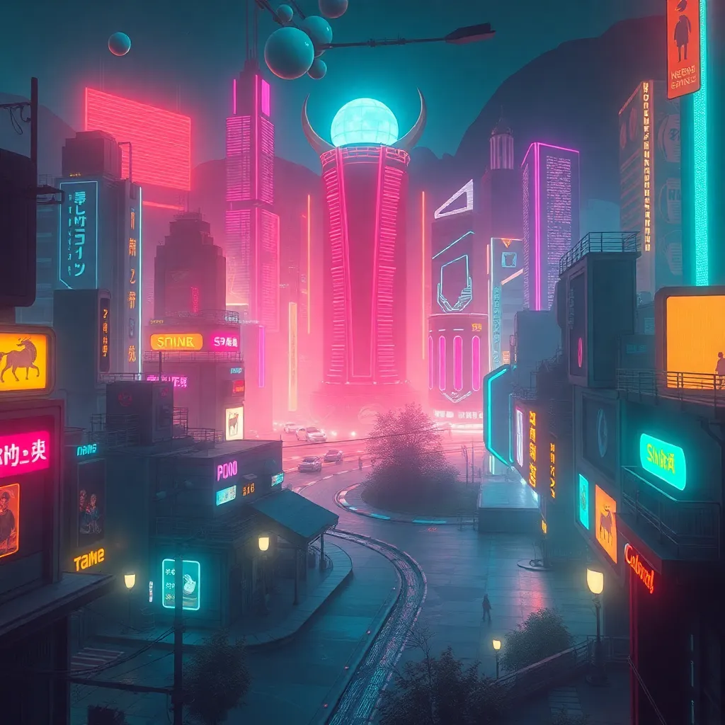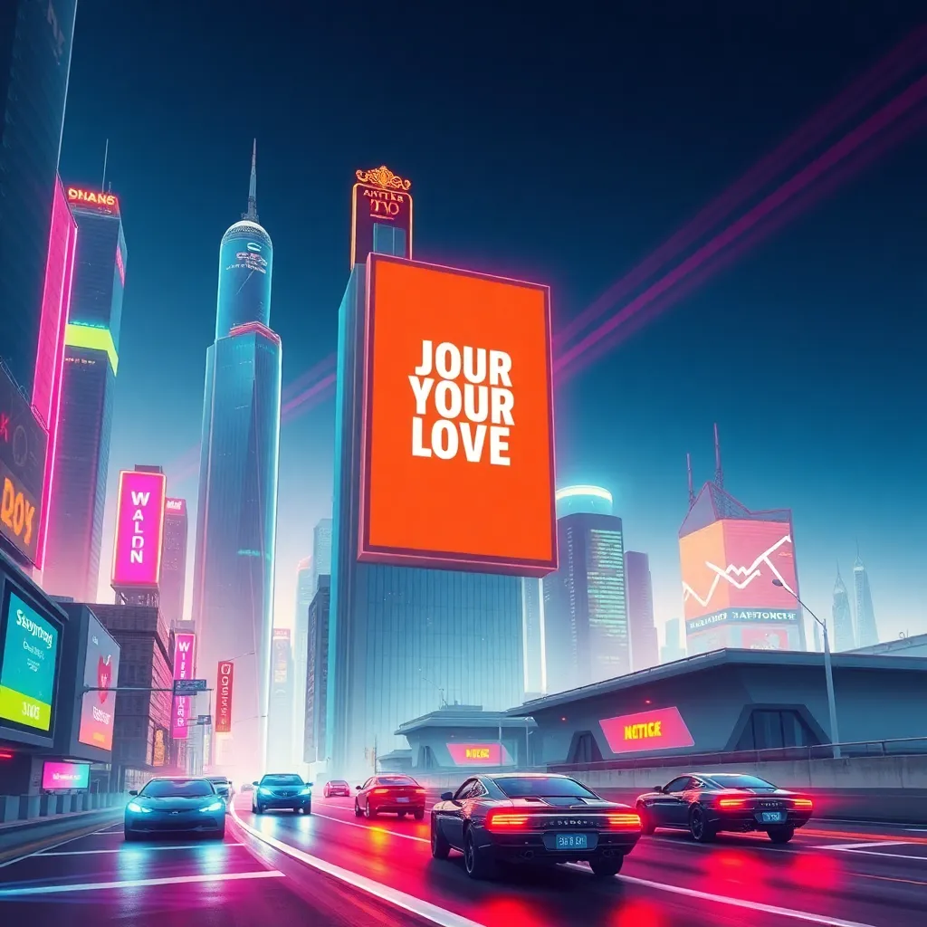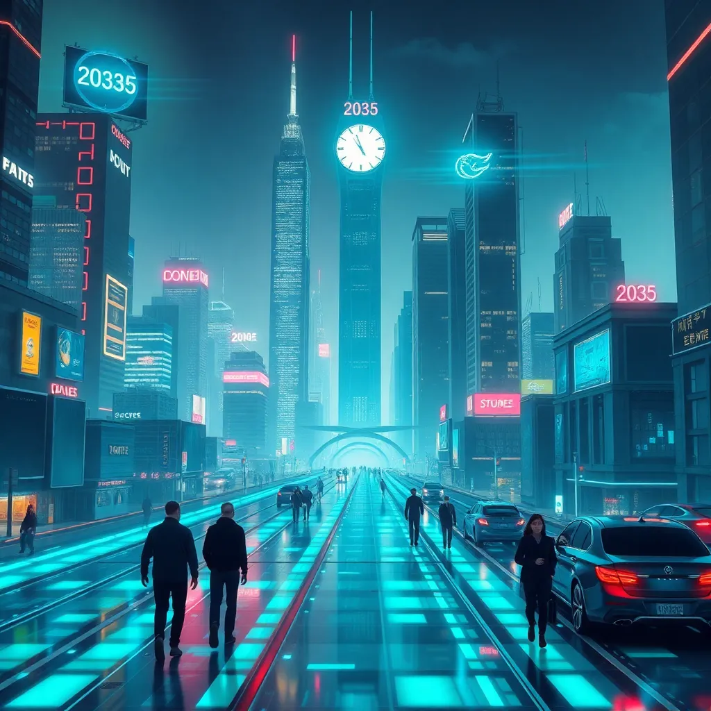 Create a futuristic cityscape with a sleek, high-tech skyscraper in the center, surrounded by flying cars and hoverbikes zipping by. Incorporate neon lights and holographic advertisements, with a giant digital clock tower looming in the background. The atmosphere should be vibrant and energetic, with a hint of nostalgia.