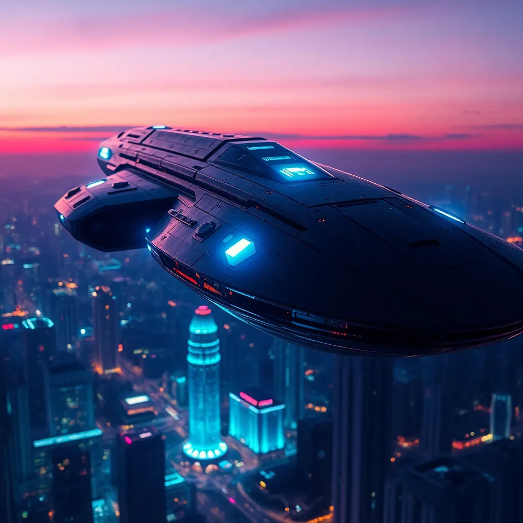 Create a visually striking image for a futuristic sci-fi short film. Depict a sleek, high-tech spacecraft hovering above a neon-lit cityscape at dusk. Incorporate vibrant blues and purples, with subtle glow effects. The ship's surface should feature intricate details and metallic textures. Generate an image that exudes a sense of otherworldly wonder.