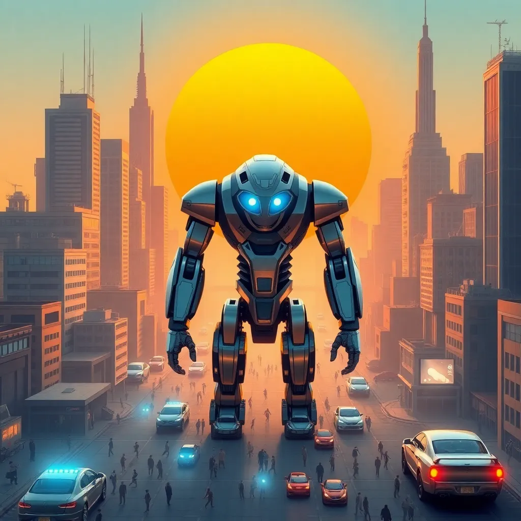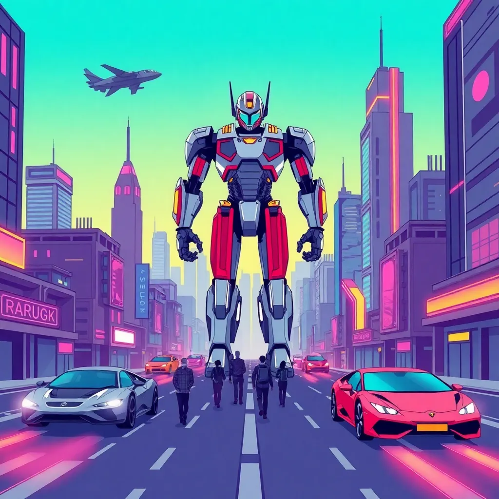 Create a futuristic cityscape with sleek skyscrapers, neon lights, and flying cars zooming by. Incorporate a giant robot standing tall in the center, with humans walking around it, showcasing a harmonious blend of technology and urban living. Use vibrant colors and bold lines to bring this futuristic world to life.