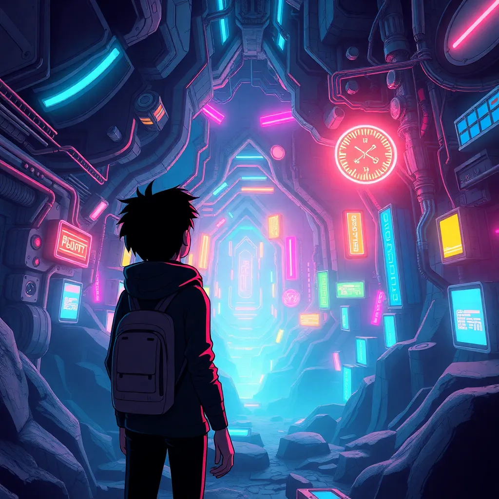 Create a futuristic animation showcasing a person discovering a hidden underground city filled with neon lights and futuristic technology. The animation should include a mix of close-ups, wide shots, and dynamic camera movements to capture the sense of wonder and excitement. Incorporate a pulsing electronic soundtrack.
