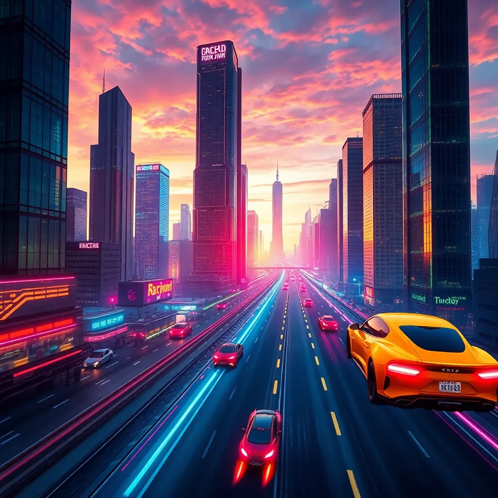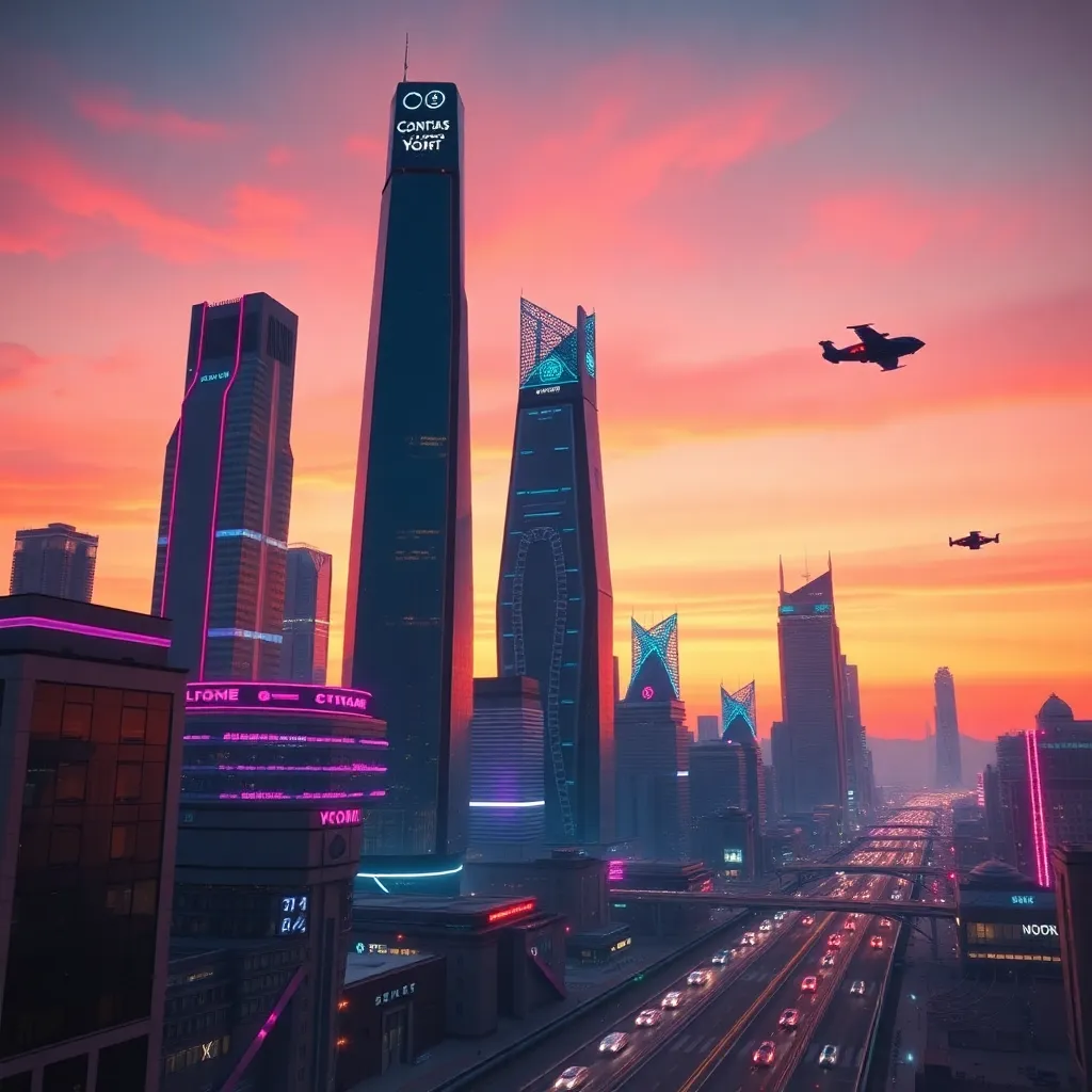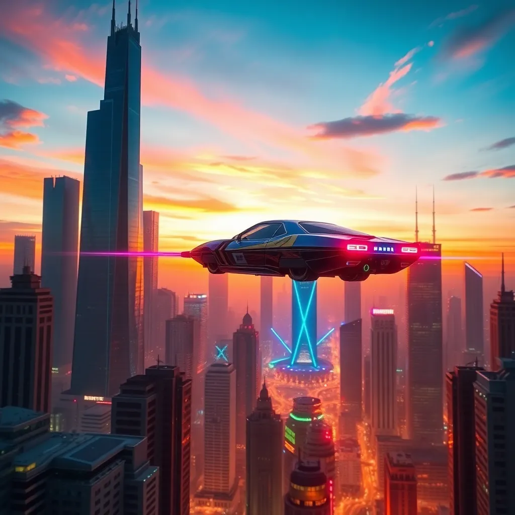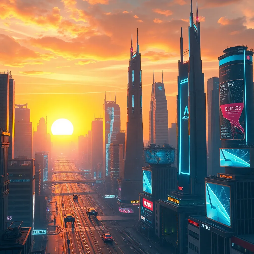 Create a futuristic cityscape at sunset, with towering skyscrapers, flying cars, and a vibrant atmosphere. Incorporate neon lights, holographic advertisements, and a subtle glow emanating from the city's infrastructure. The image should exude a sense of innovation, progress, and excitement for the future.