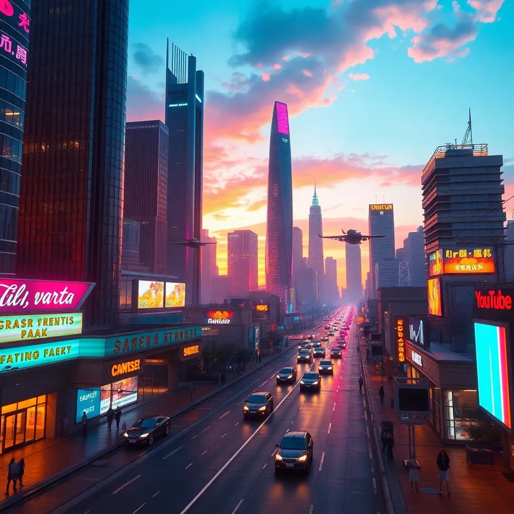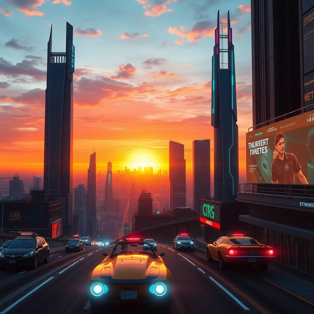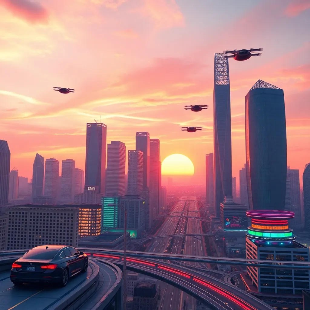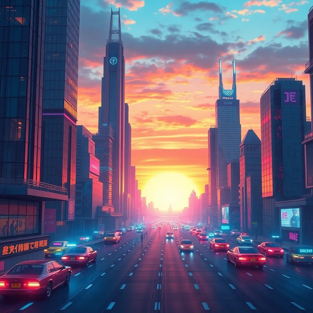 Create a futuristic cityscape at sunset, with towering skyscrapers, flying cars, and a vibrant atmosphere. Incorporate neon lights, holographic advertisements, and a subtle glow emanating from the city's infrastructure. The image should exude a sense of innovation, progress, and excitement for the future.