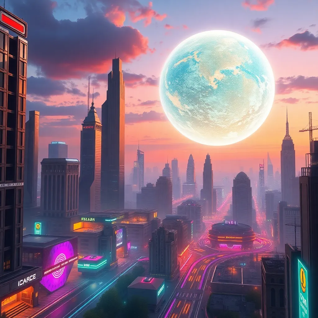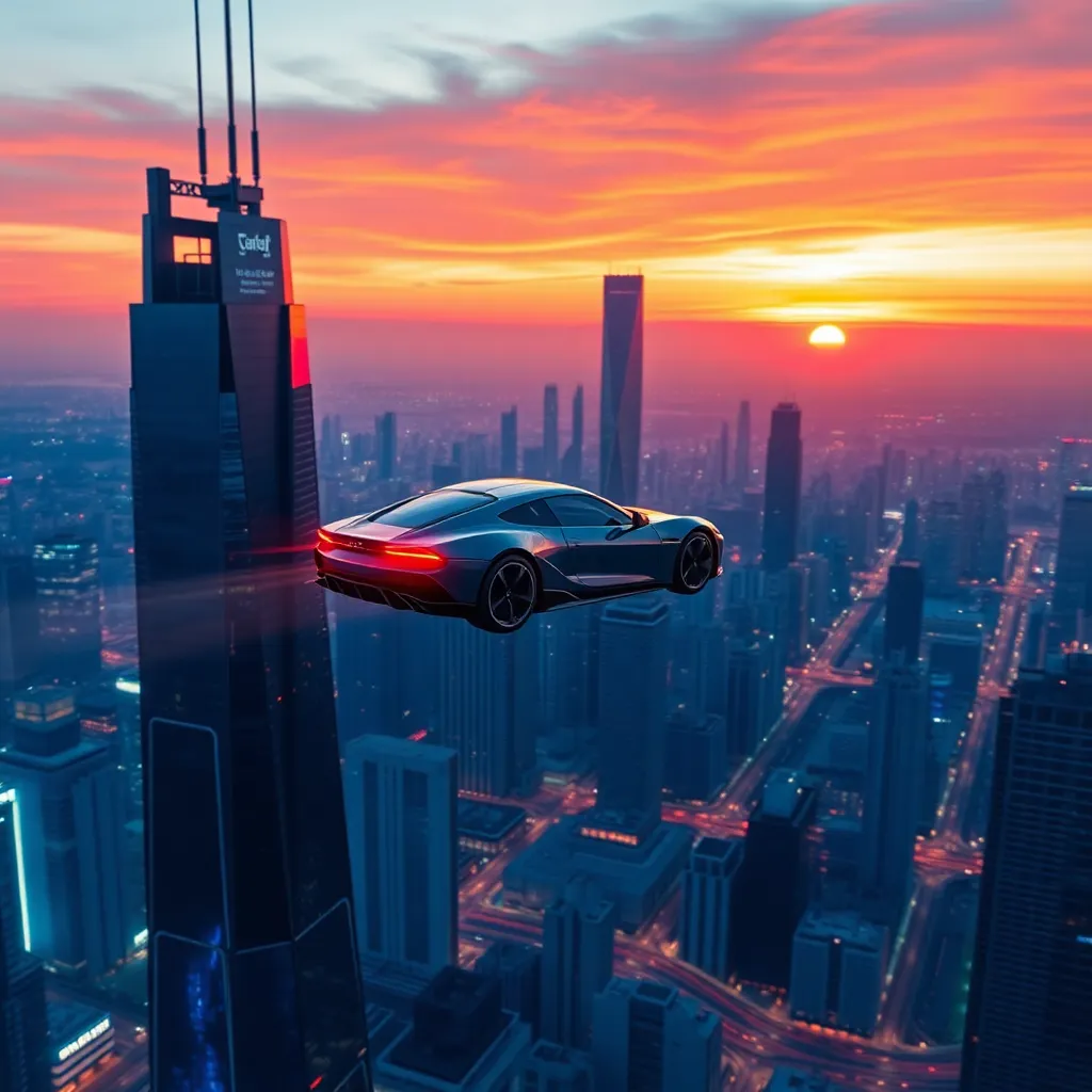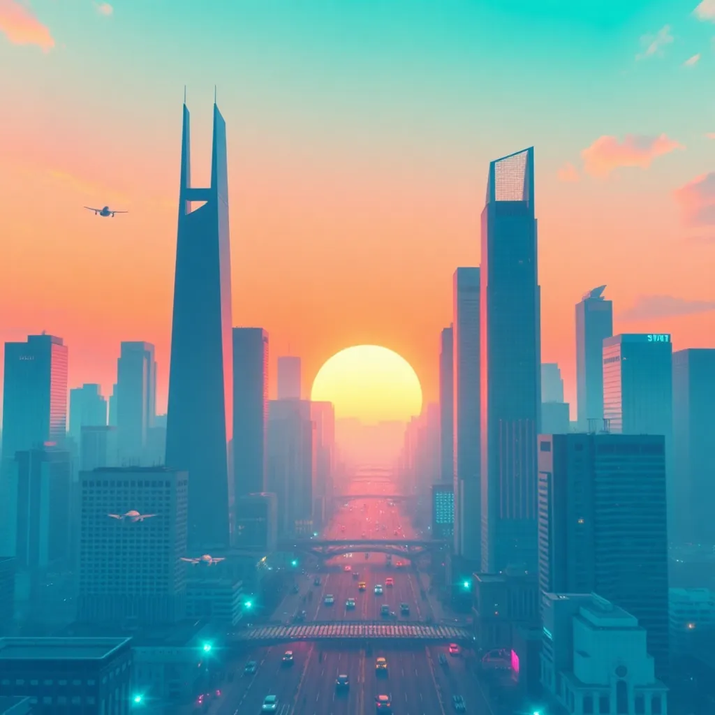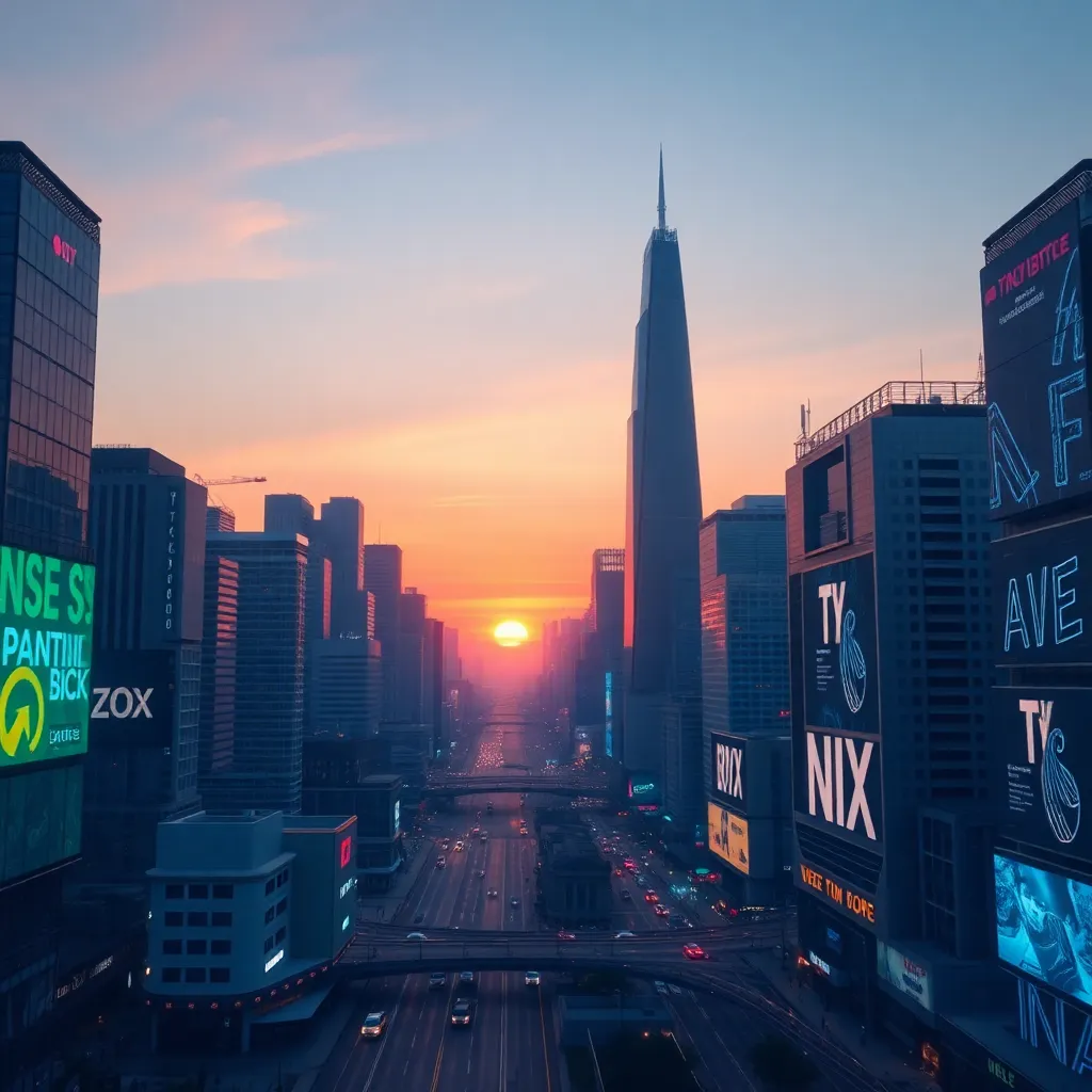 Create a futuristic cityscape at sunset, with towering skyscrapers, flying cars, and a vibrant atmosphere. Incorporate neon lights, holographic advertisements, and a subtle glow emanating from the city's infrastructure. The image should exude a sense of innovation, progress, and excitement for the future.