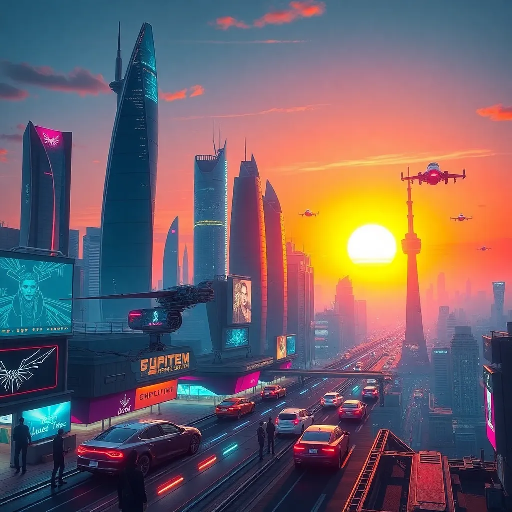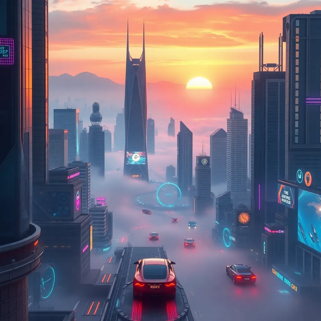 Create a futuristic cityscape at sunrise, with sleek skyscrapers, flying cars, and humans going about their daily lives. Incorporate neon lights, holographic advertisements, and a vibrant color palette. The image should evoke a sense of excitement, innovation, and possibility, with a subtle hint of sci-fi mystery.