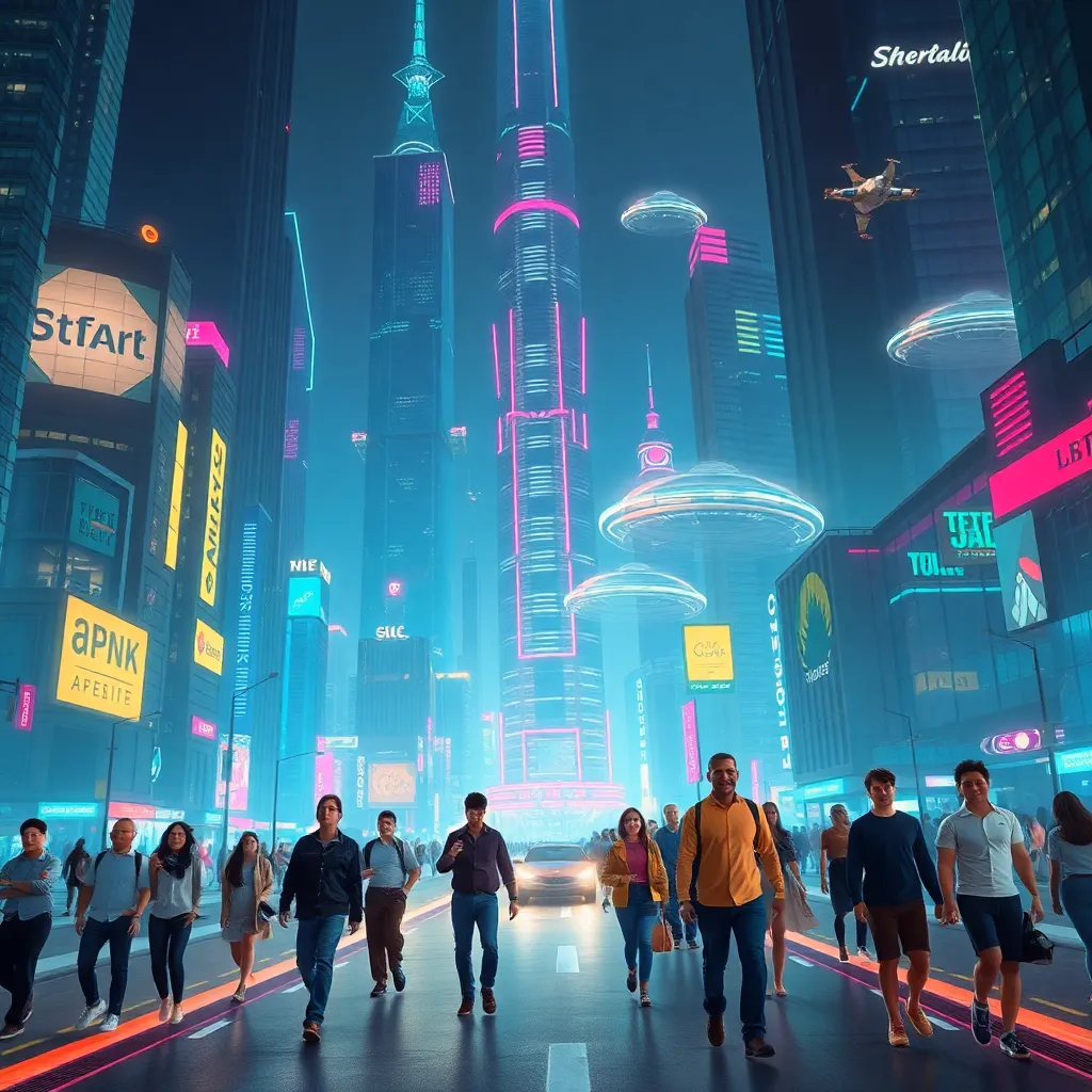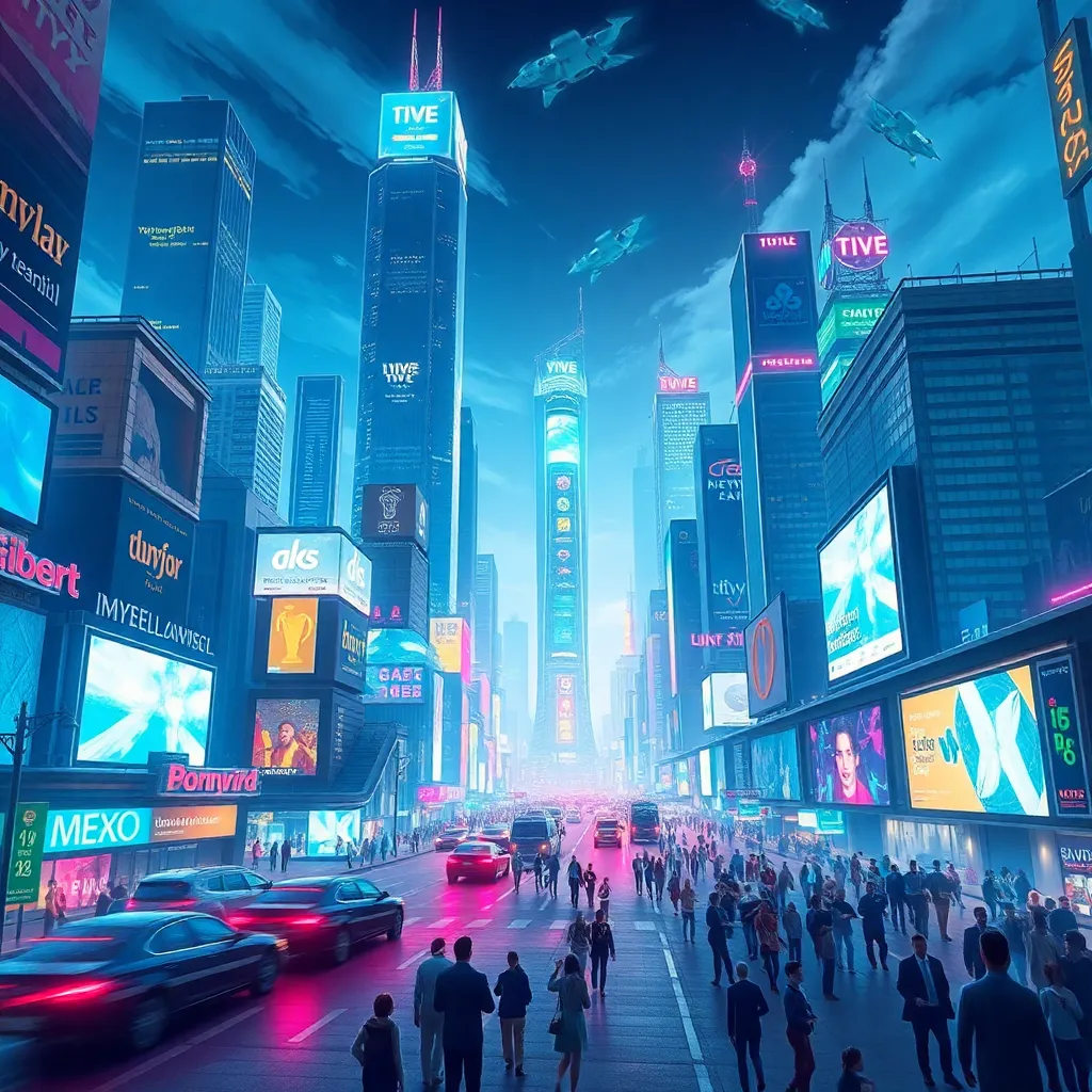 Create a futuristic cityscape with towering skyscrapers and flying cars zipping by. Incorporate neon lights and holographic advertisements. The city should be bustling with people from all walks of life, showcasing a vibrant and diverse community. The image should be bright, colorful, and full of energy.