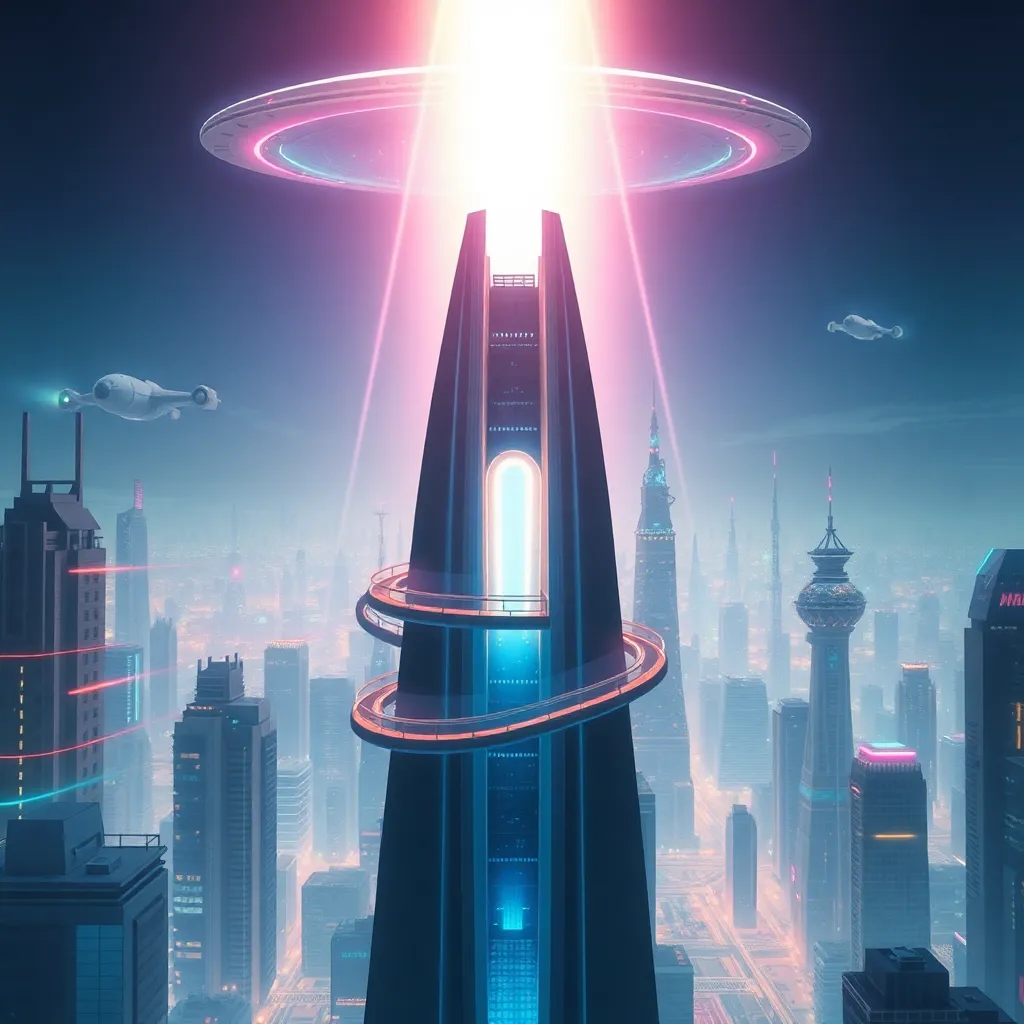 Create a futuristic cityscape with a sleek, high-tech skyscraper at its center. The building should have a glowing blue core and a winding, neon-lit walkway around it. In the background, a massive spaceship is descending, emitting a bright light that illuminates the surrounding city. Incorporate vibrant colors and dynamic motion lines.