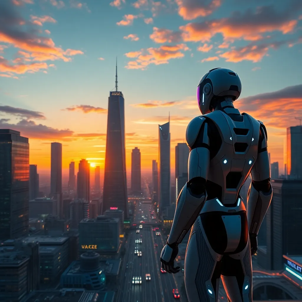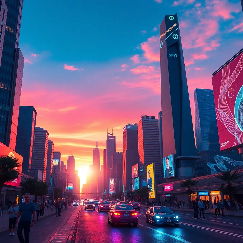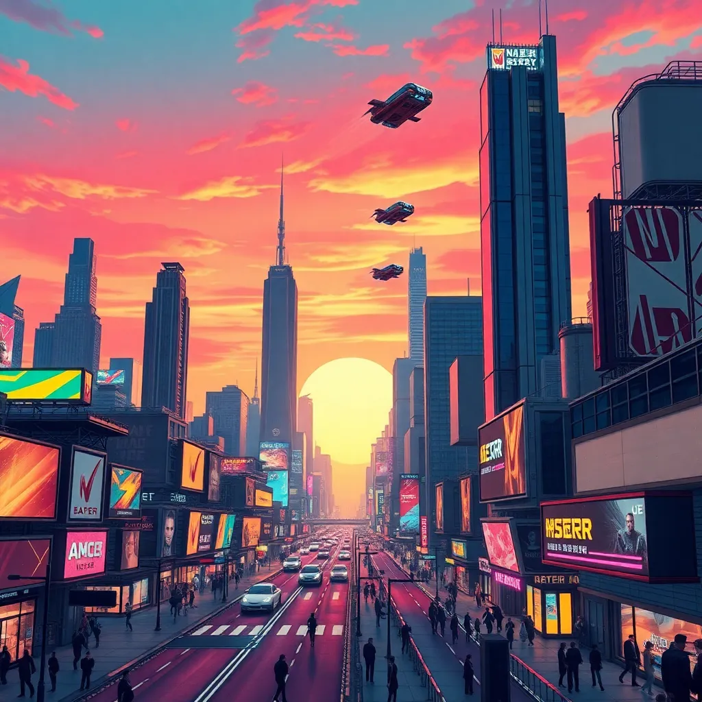 Create a futuristic cityscape at sunset with towering skyscrapers, flying cars zipping by, and a vibrant orange-pink sky. Incorporate neon lights, holographic advertisements, and a bustling street scene with pedestrians and robots. Use bold, contrasting colors to capture the energy and excitement of this futuristic metropolis.