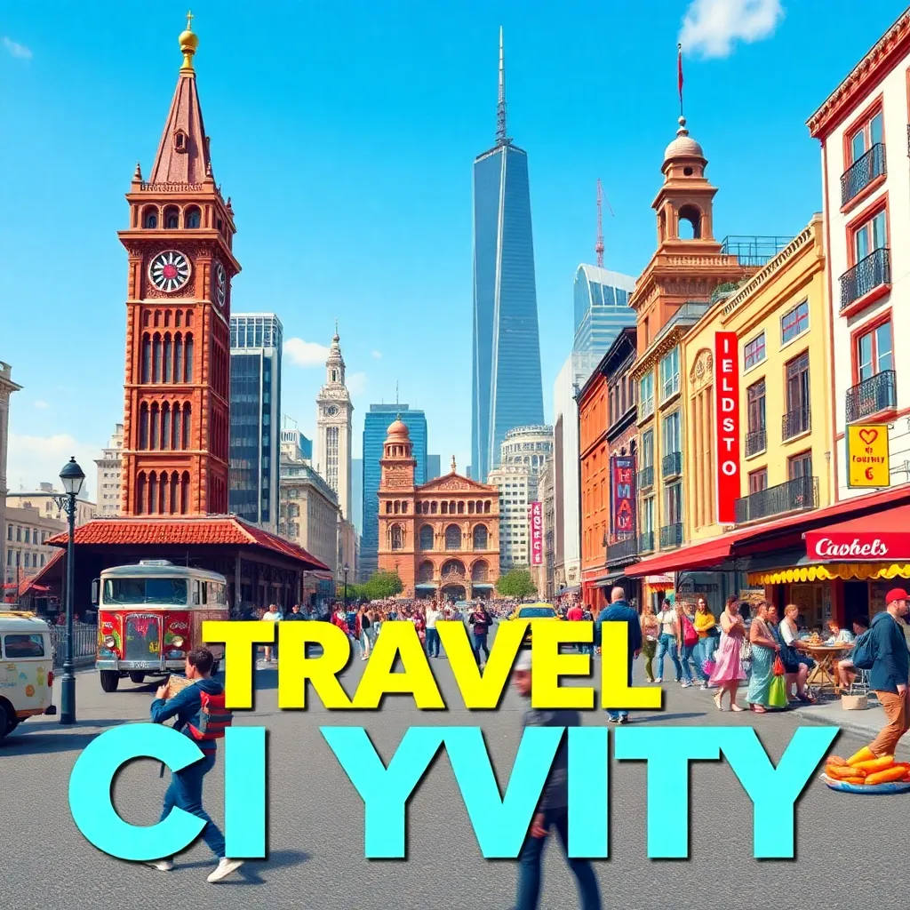 Create a visually appealing image for a YouTube Shorts video about a young traveler's exciting adventure in a vibrant city. Show a mix of architectural landmarks, street performers, and local cuisine. Incorporate bright colors, bold fonts, and dynamic textures to capture the energy and excitement of the city.