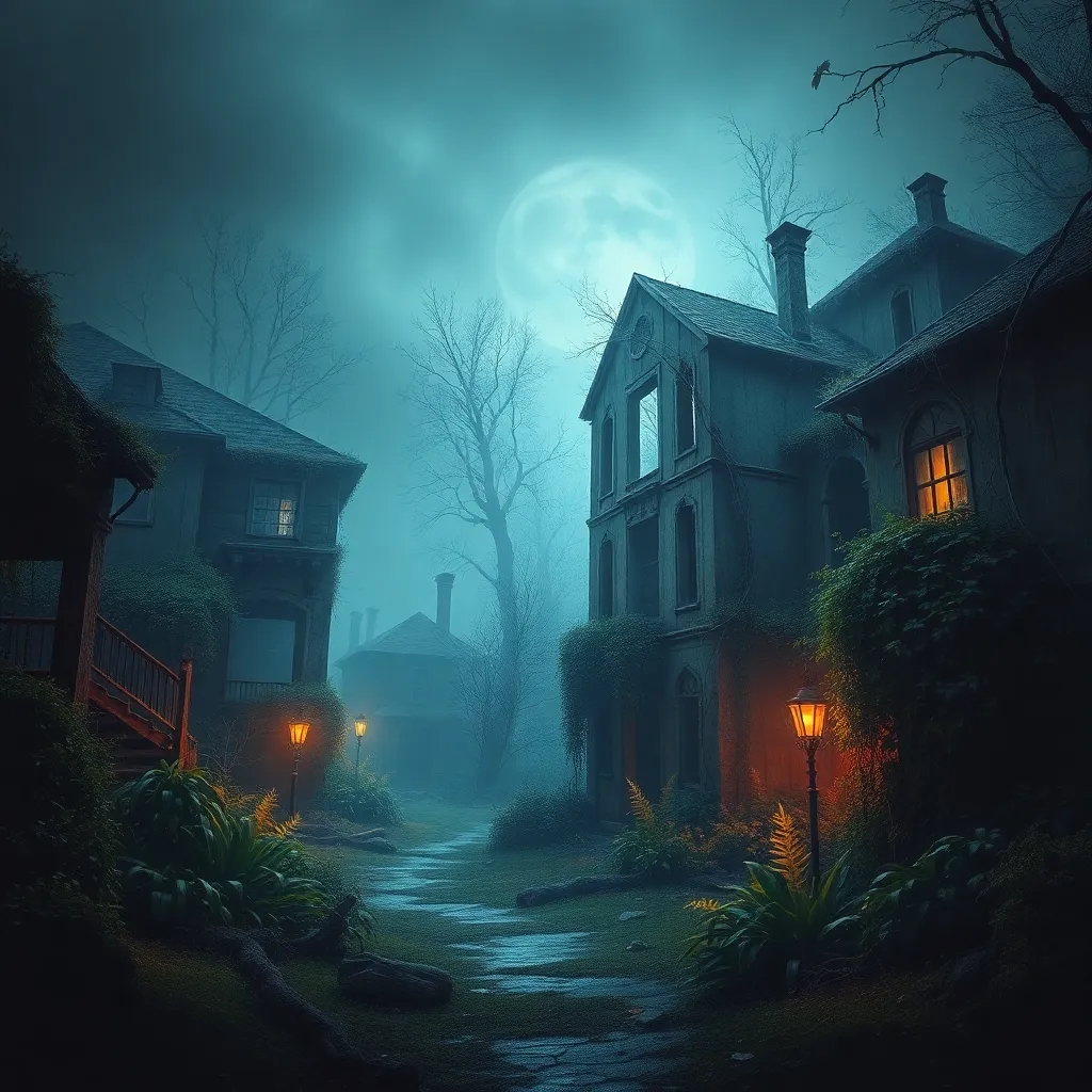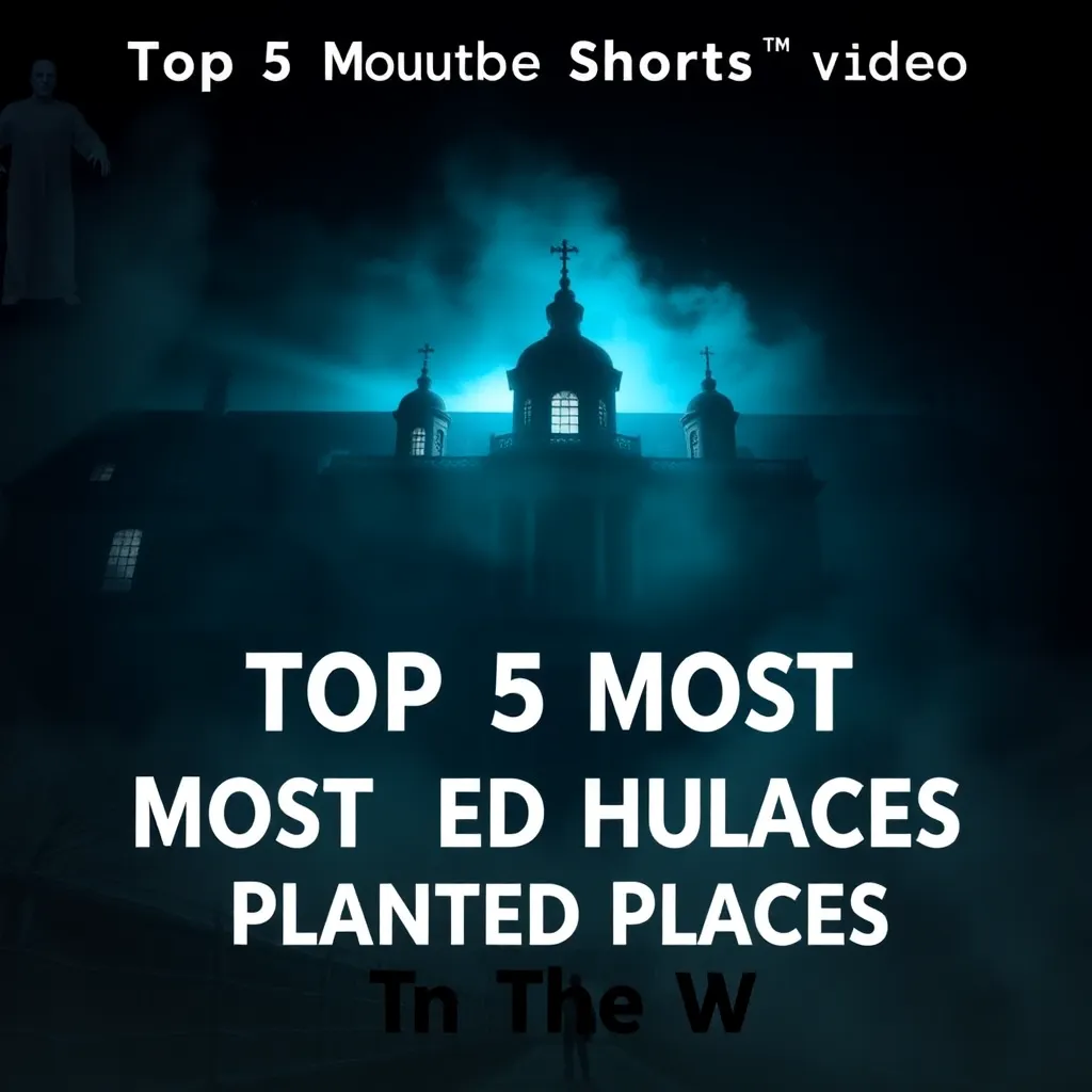 Create a visually stunning image for a YouTube Shorts video about 'Top 5 Most Haunted Places in the World'. Incorporate eerie lighting, abandoned buildings, and ghostly figures. Use a dark and moody color palette with a hint of supernatural glow. Incorporate a subtle mist or fog effect to enhance the atmosphere.