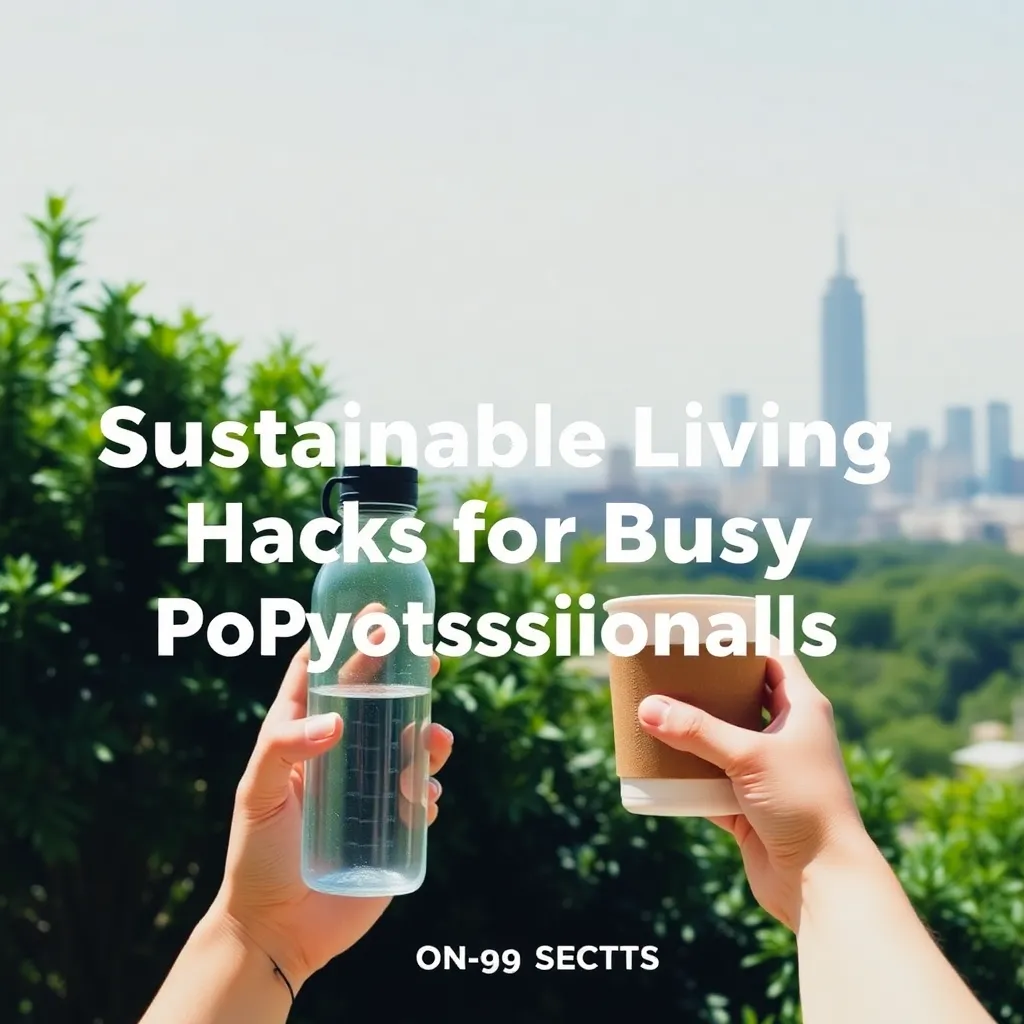 Create a visually striking image for a YouTube Shorts video about 'Sustainable Living Hacks for Busy Professionals'. Incorporate a minimalist background with a person in the foreground holding a reusable water bottle and a coffee cup. Incorporate greenery and a cityscape in the background to represent balance. Use a bright and airy color palette.