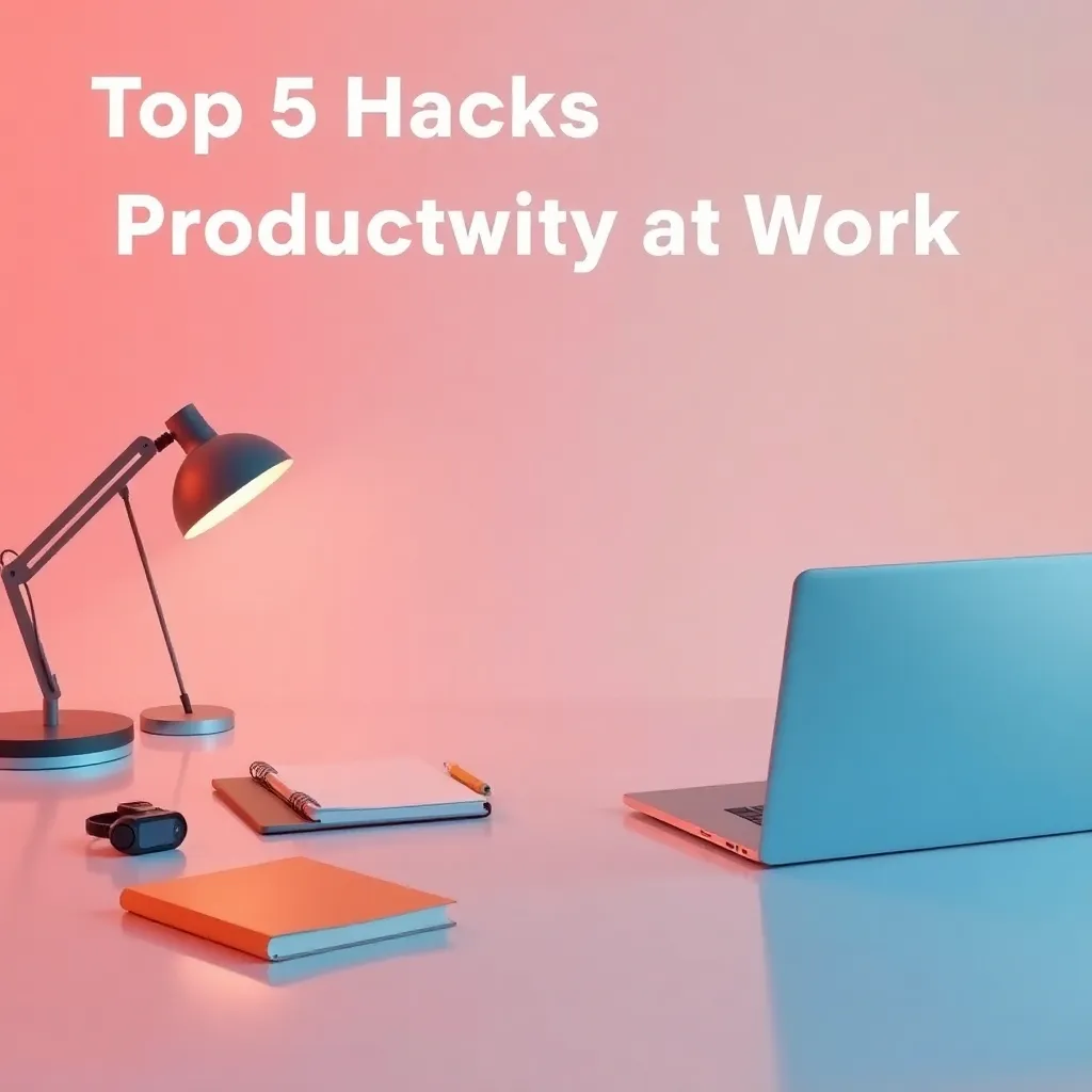 Create a visually striking AI-generated image for a YouTube Shorts video about 'Top 5 Hacks to Boost Your Productivity at Work'. The image should feature a futuristic workspace with a minimalist aesthetic, highlighting a laptop, notebook, and a few productivity-enhancing gadgets, with a bold and colorful design.