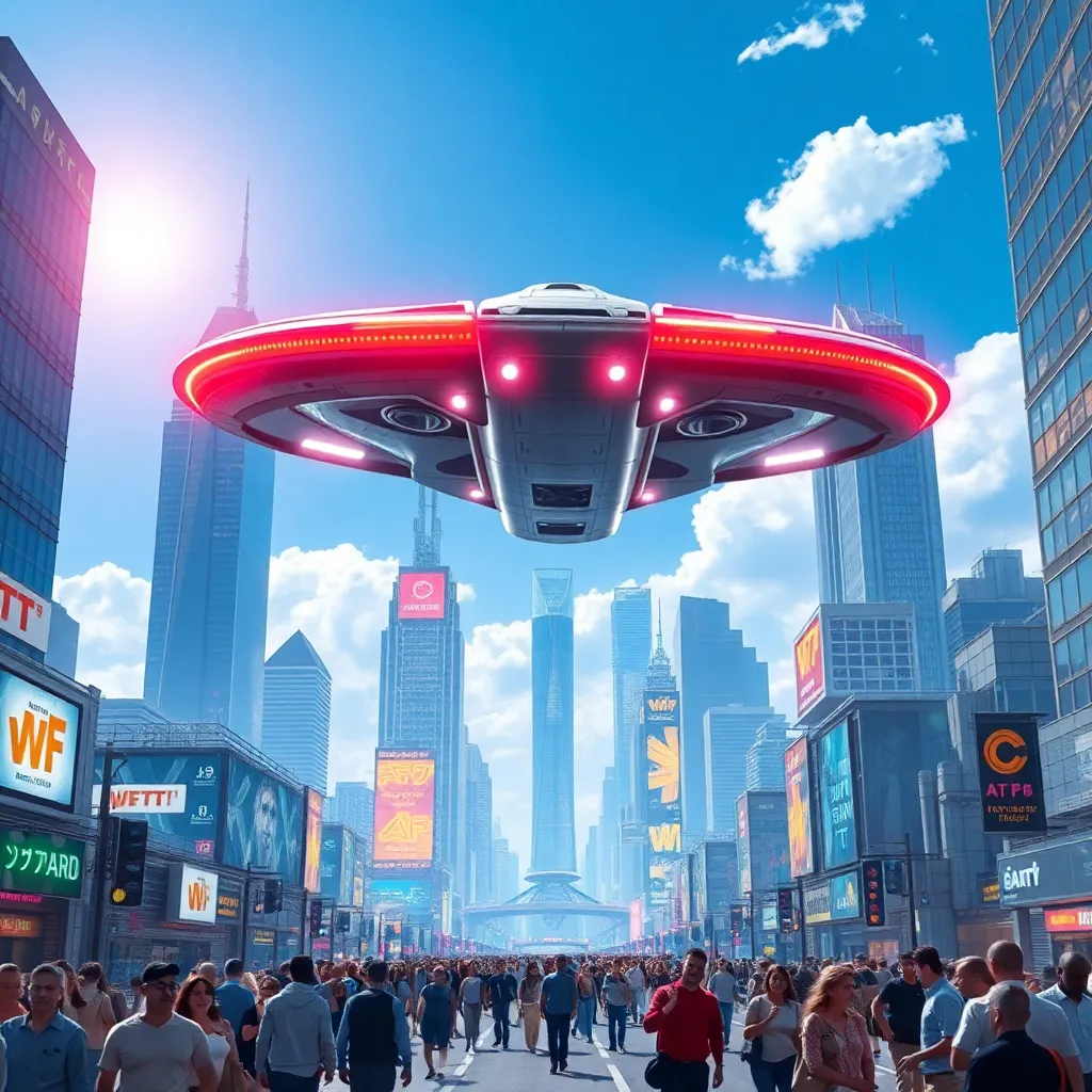 Create a futuristic cityscape with a bright blue sky, towering skyscrapers, and a sleek, high-tech spaceship landing in the foreground. Incorporate neon lights, holographic advertisements, and a bustling street scene with people of diverse backgrounds. Use vibrant colors and a sense of excitement and wonder.