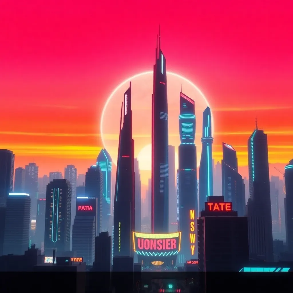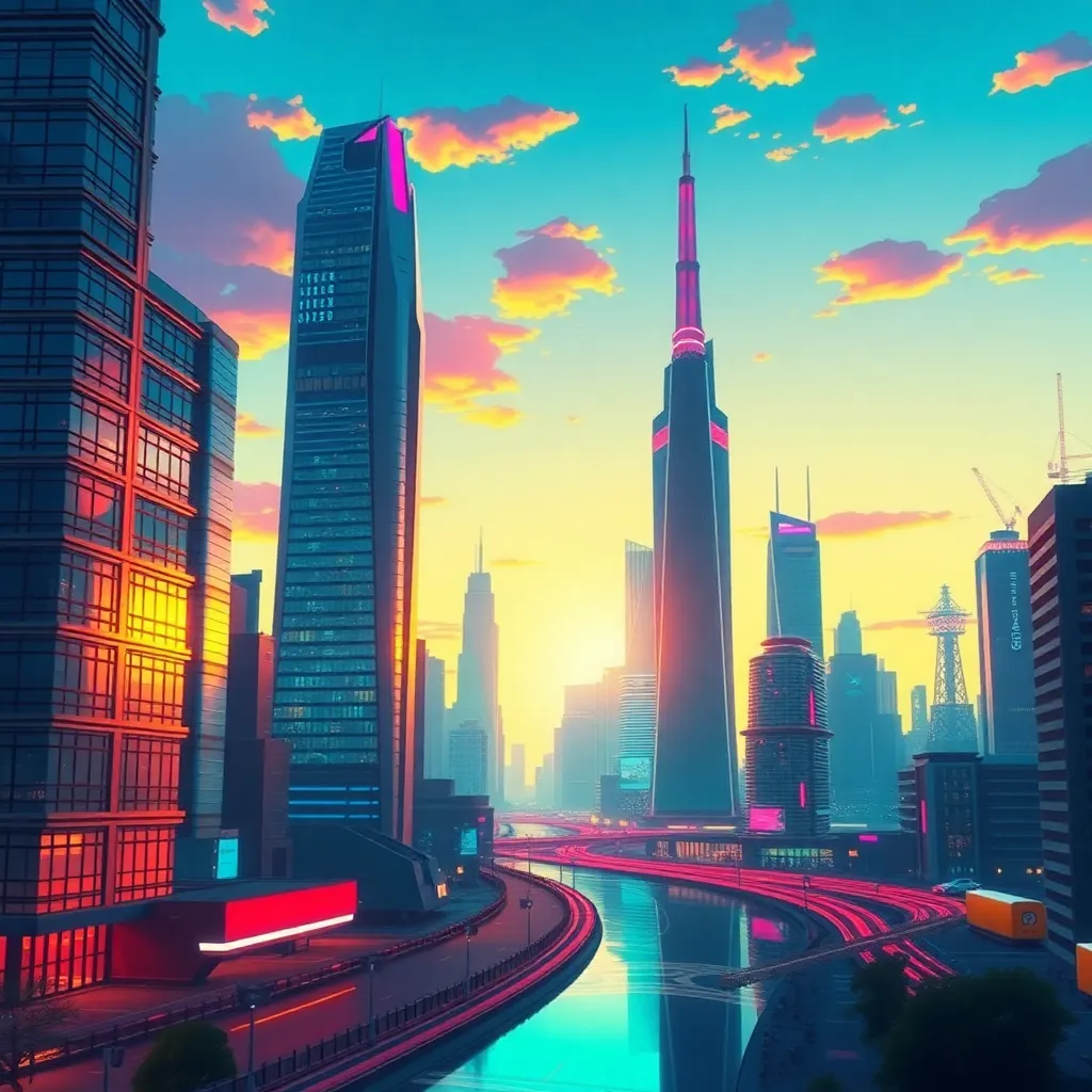 Create a visually stunning image for a YouTube Shorts video about a futuristic cityscape at sunset. Incorporate sleek skyscrapers, neon lights, and a vibrant orange-pink sky. The image should evoke a sense of wonder and excitement, with a dash of sci-fi flair. Use bold lines, vibrant colors, and a dynamic composition.