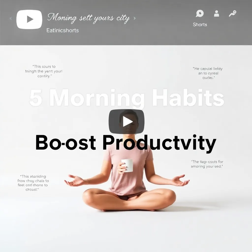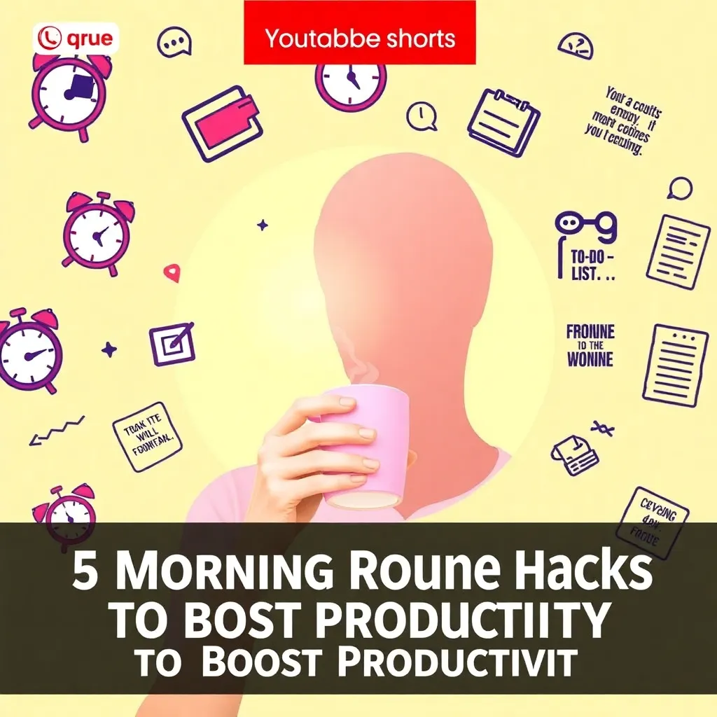 Create a visually stunning image for a YouTube Shorts video about '5 Morning Routine Hacks to Boost Productivity'. The image should feature a bright and colorful background with a person sipping coffee, surrounded by icons of alarm clocks, to-do lists, and motivational quotes, conveying a sense of energy and motivation.