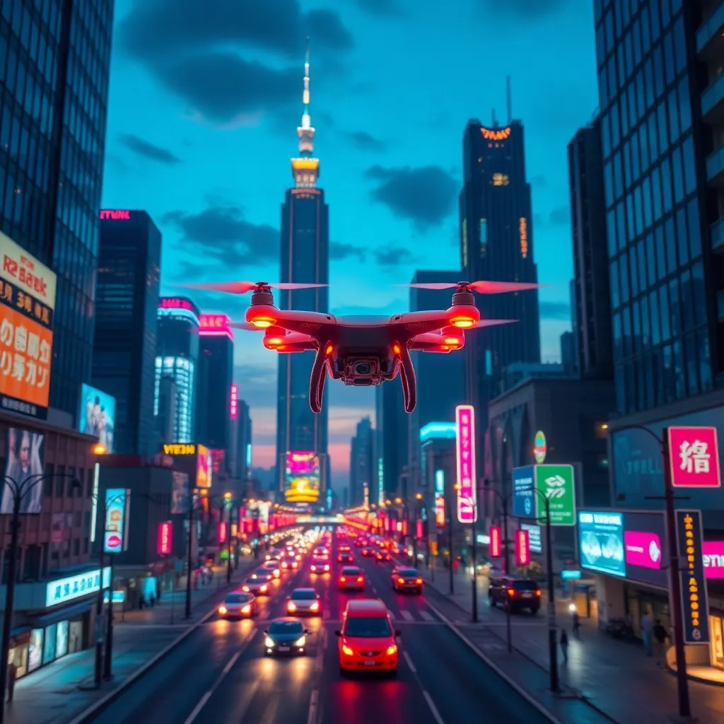 Create a futuristic cityscape with neon lights and towering skyscrapers at dusk. Incorporate a hovering drone delivering packages to a busy street. Use vibrant colors and dynamic textures. Add a hint of nostalgia with retro-style streetlights. The image should evoke a sense of innovation and progress.