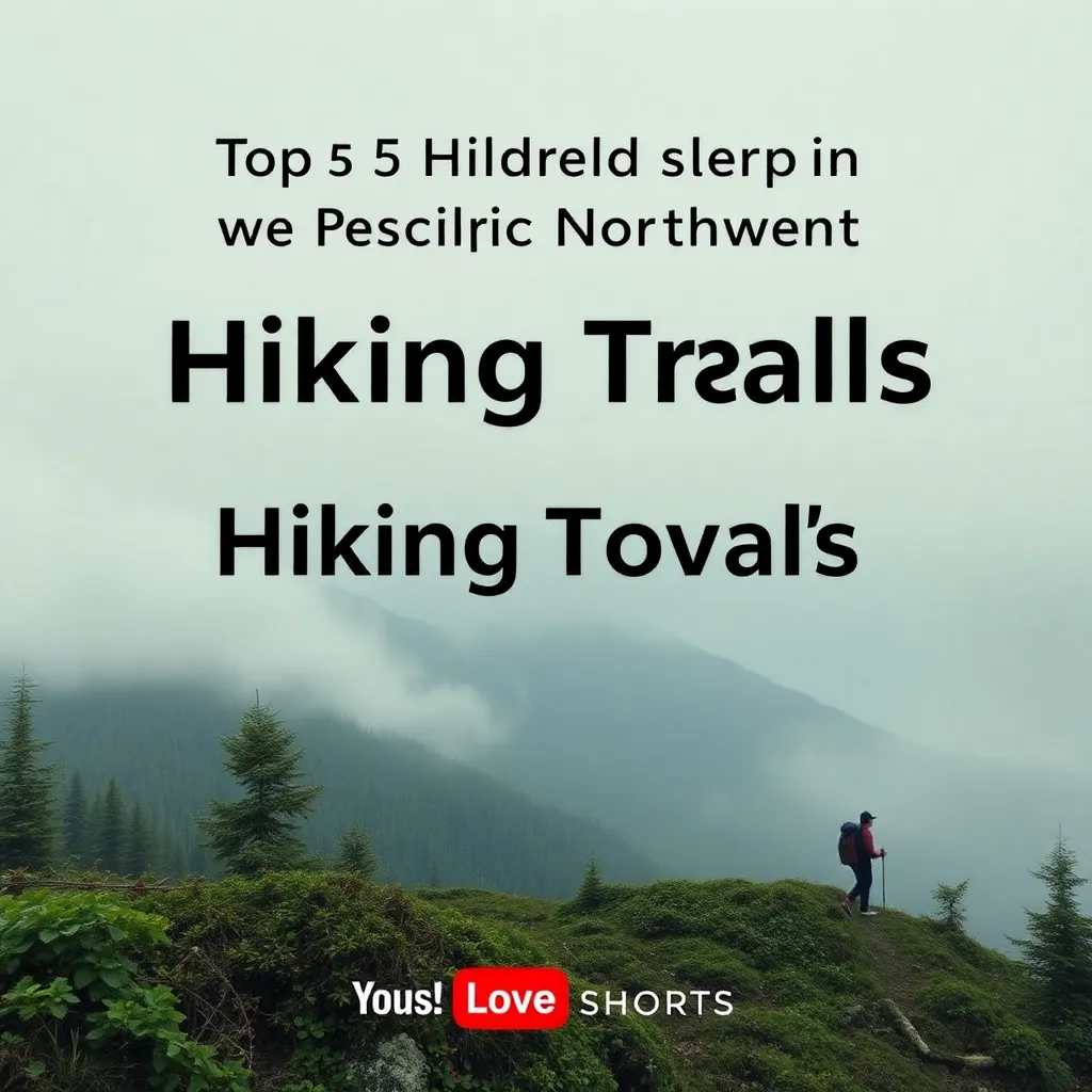 Create an eye-catching image for a YouTube Shorts video about 'Top 5 Hiking Trails in the Pacific Northwest'. The image should feature a serene mountain landscape with a hiker in the distance, surrounded by lush greenery and a misty atmosphere. Incorporate a subtle gradient effect and a sense of adventure.