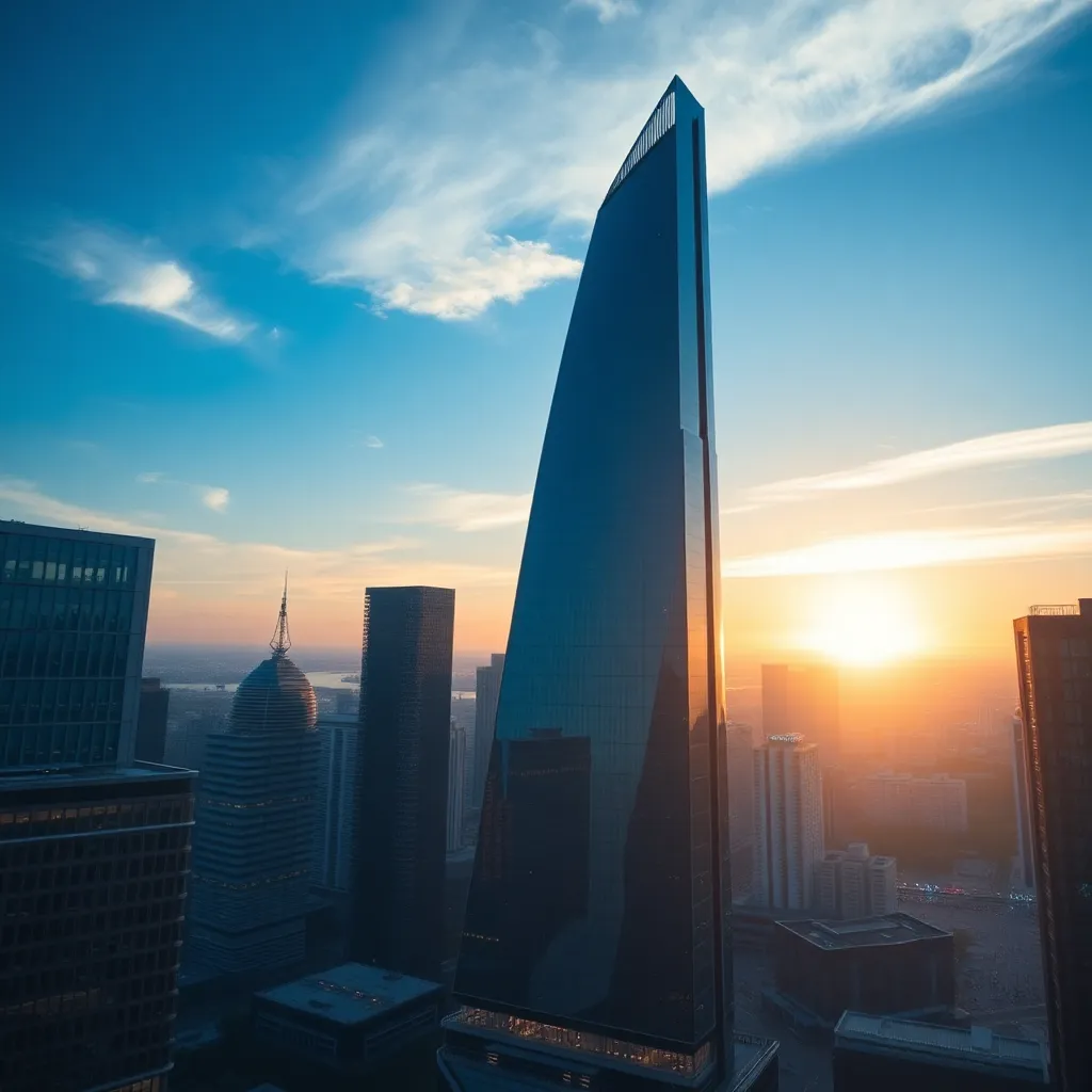 Create a visually appealing image for a YouTube Shorts video about a futuristic city at sunrise. The image should feature a sleek skyscraper with a bright blue sky and vibrant cityscape. Incorporate elements of technology, innovation, and sustainability. The mood should be optimistic and energizing, perfect for a morning motivational video.