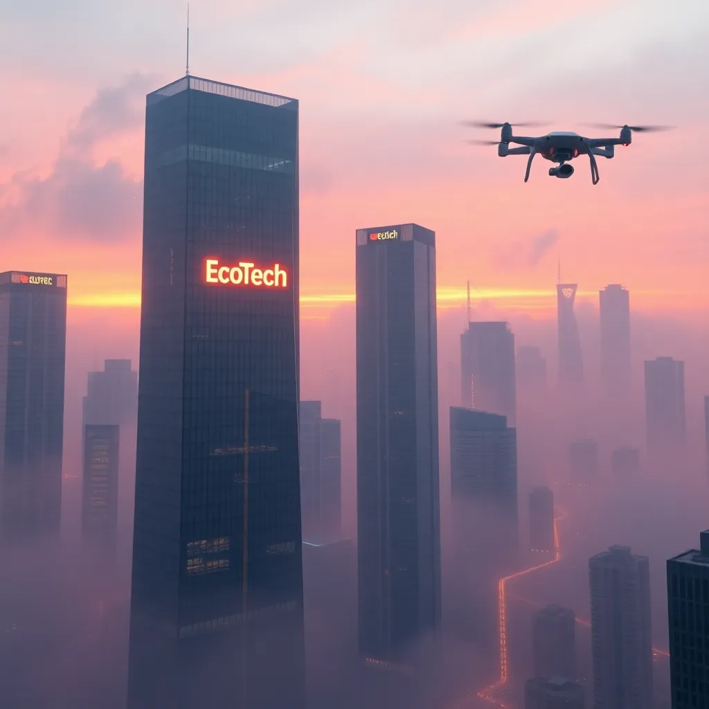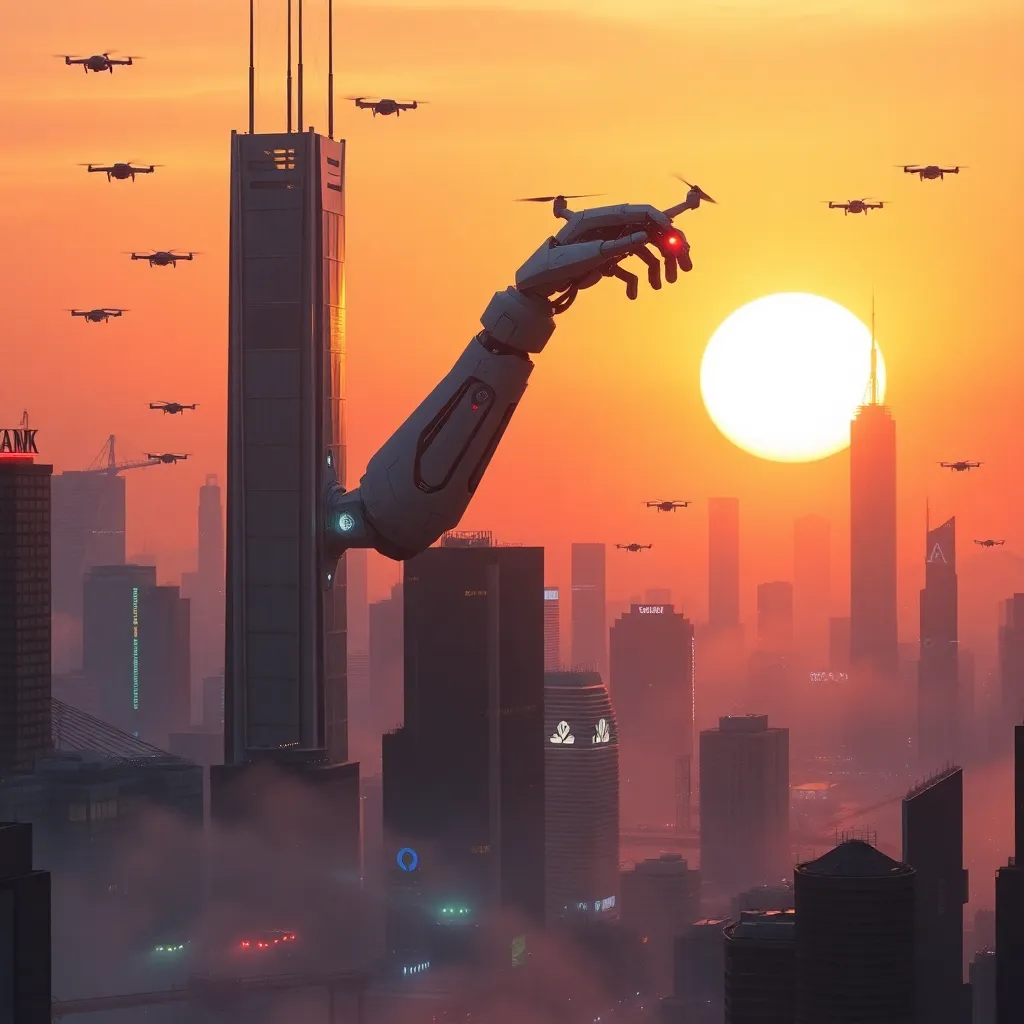 Create a futuristic cityscape at sunset with a giant robotic arm reaching out from a skyscraper, surrounded by hovering drones and sleek flying cars. Incorporate neon lights, misty fog, and a vibrant orange-pink sky. The robot's arm should be holding a glowing orb, symbolizing innovation and progress.