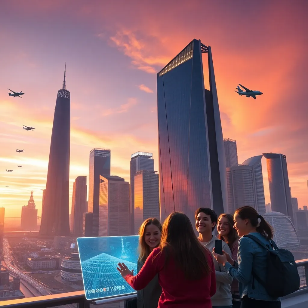 Imagine a futuristic cityscape at sunset, with sleek skyscrapers and flying cars zipping by. The sky is painted with hues of orange, pink, and purple. In the foreground, a group of friends are gathered around a holographic display, laughing and taking selfies. Generate an AI image that captures this scene.