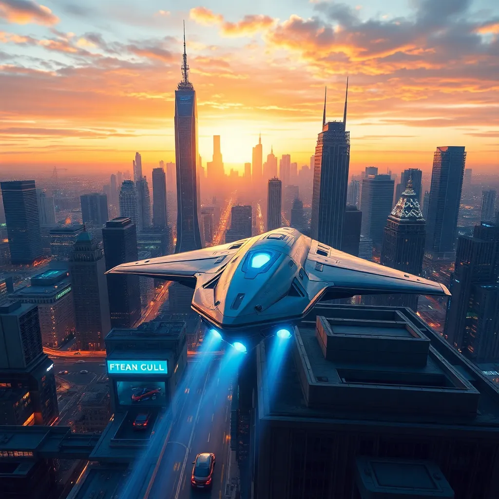 Create a vibrant, futuristic cityscape at sunrise, with towering skyscrapers and flying cars zipping by. Incorporate a sleek, silver spaceship landing on the rooftop of a futuristic high-rise building, with a bright blue glow emanating from its engines. Add a sense of excitement and adventure to the scene.