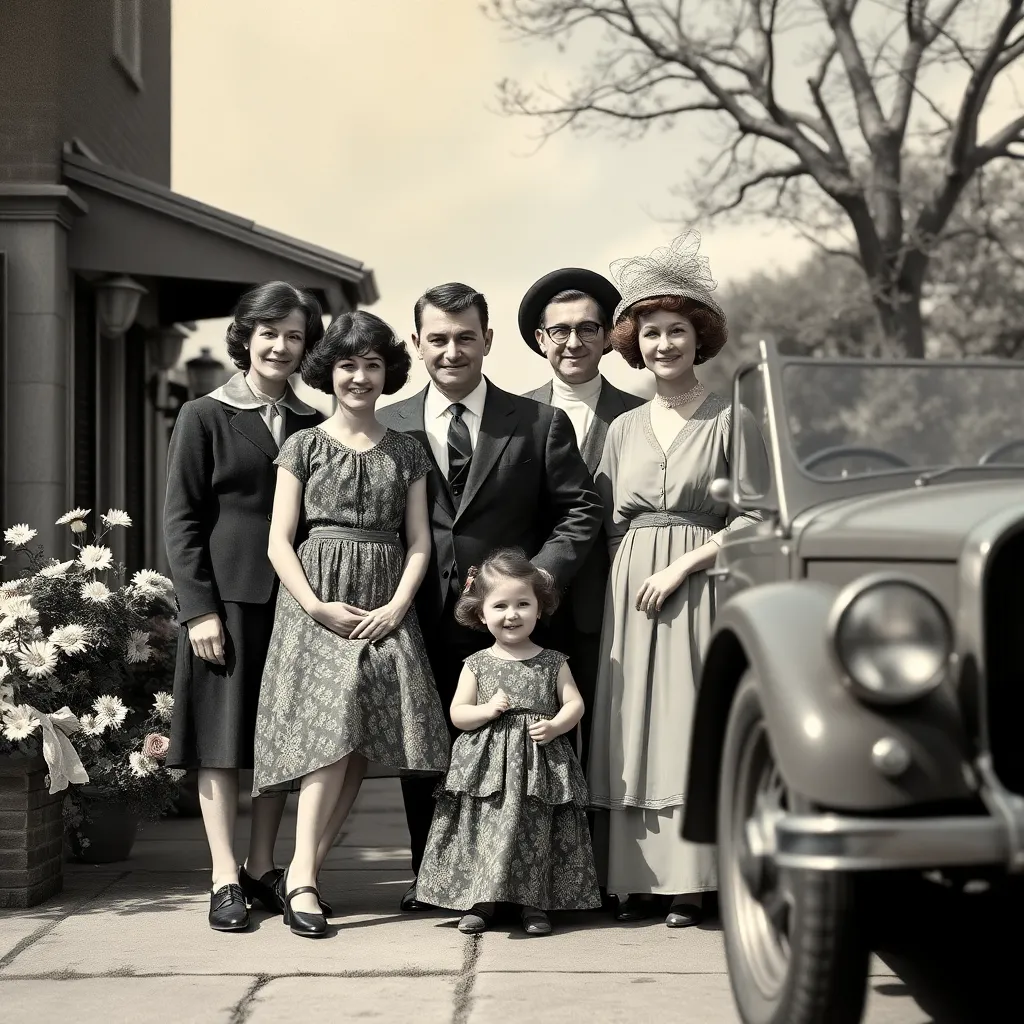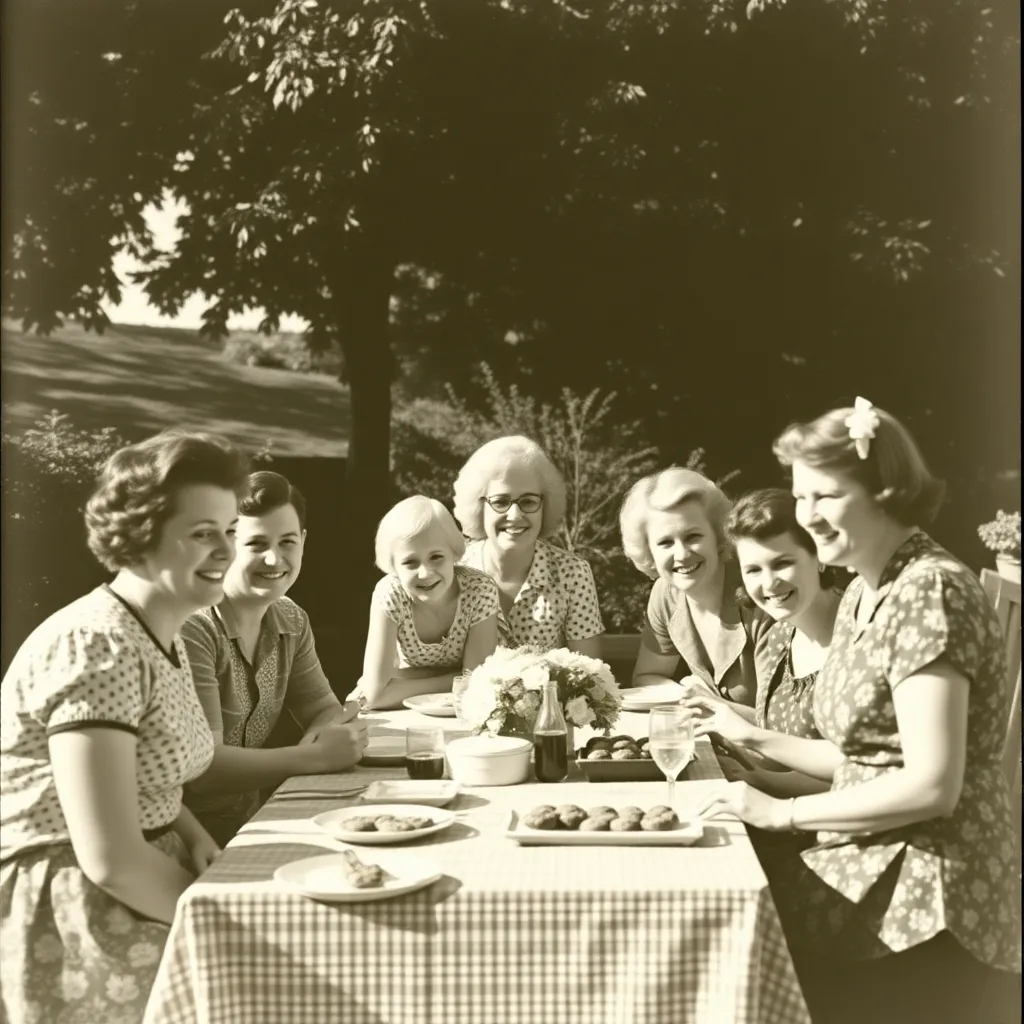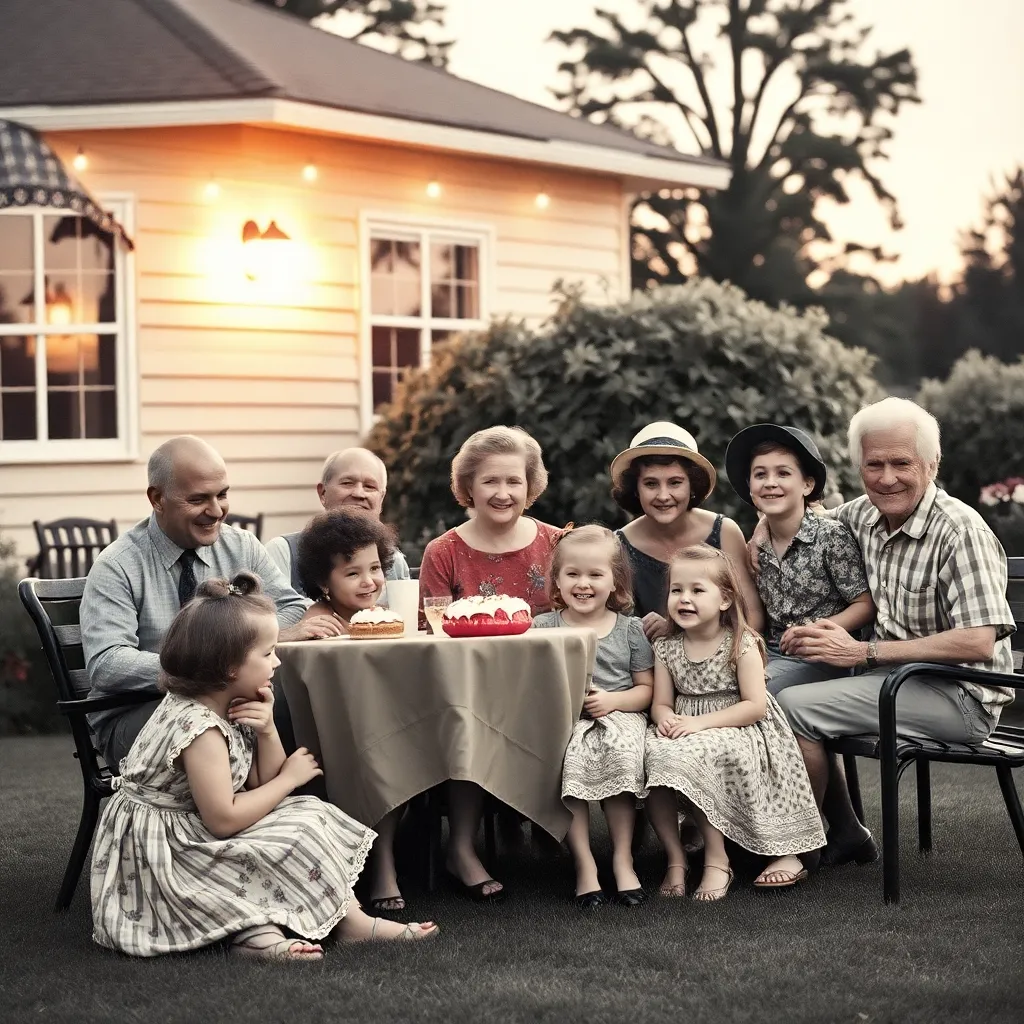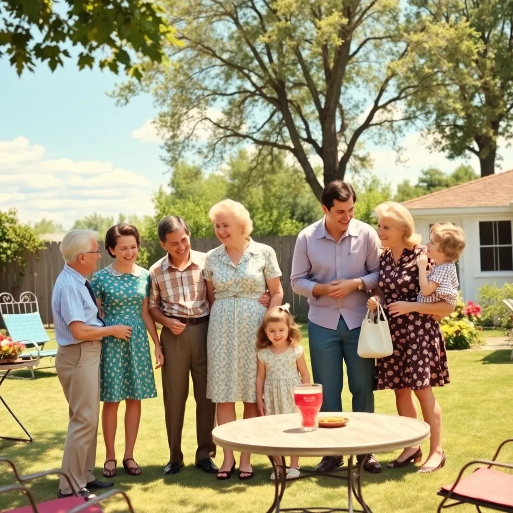 Bring to life a vintage family gathering from the 1950s. A warm summer afternoon, a sprawling backyard, and a group of loved ones laughing and embracing. Incorporate period-specific clothing, hairstyles, and props to create a nostalgic and inviting atmosphere. Add subtle animations to capture the joy and warmth of the moment.