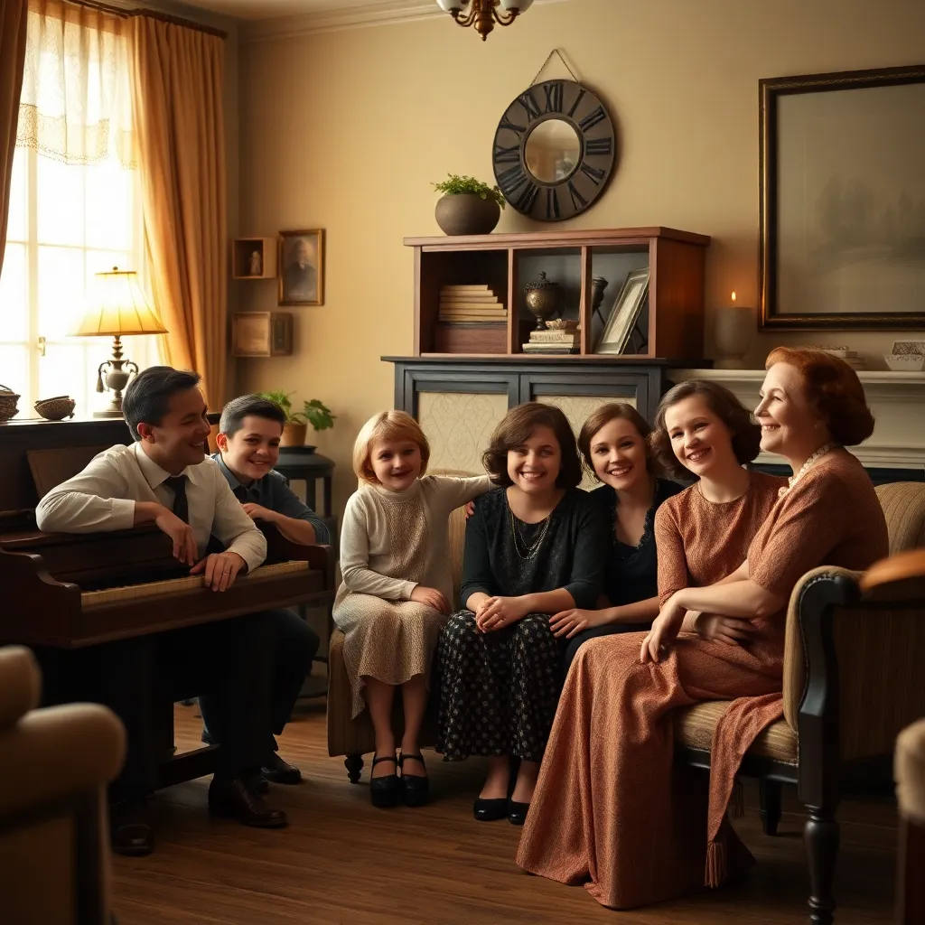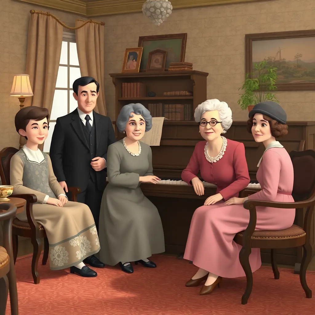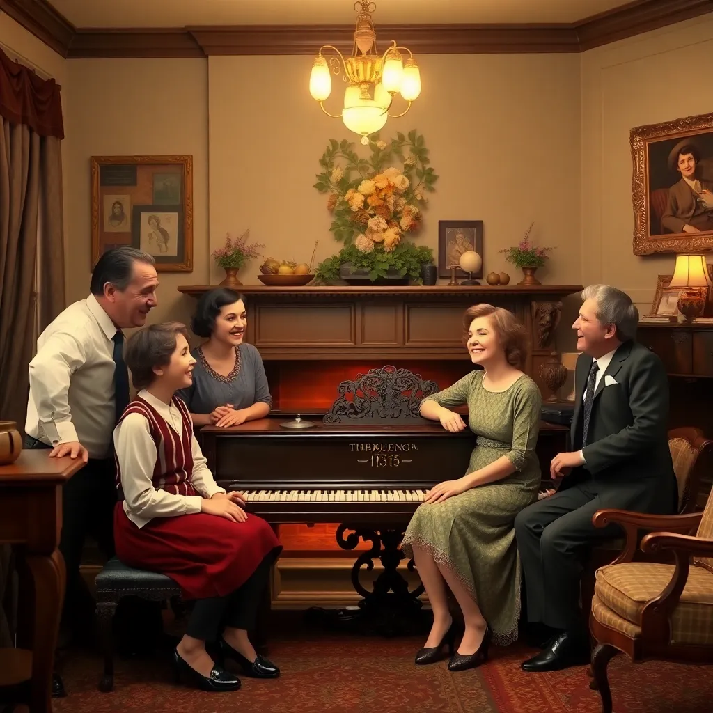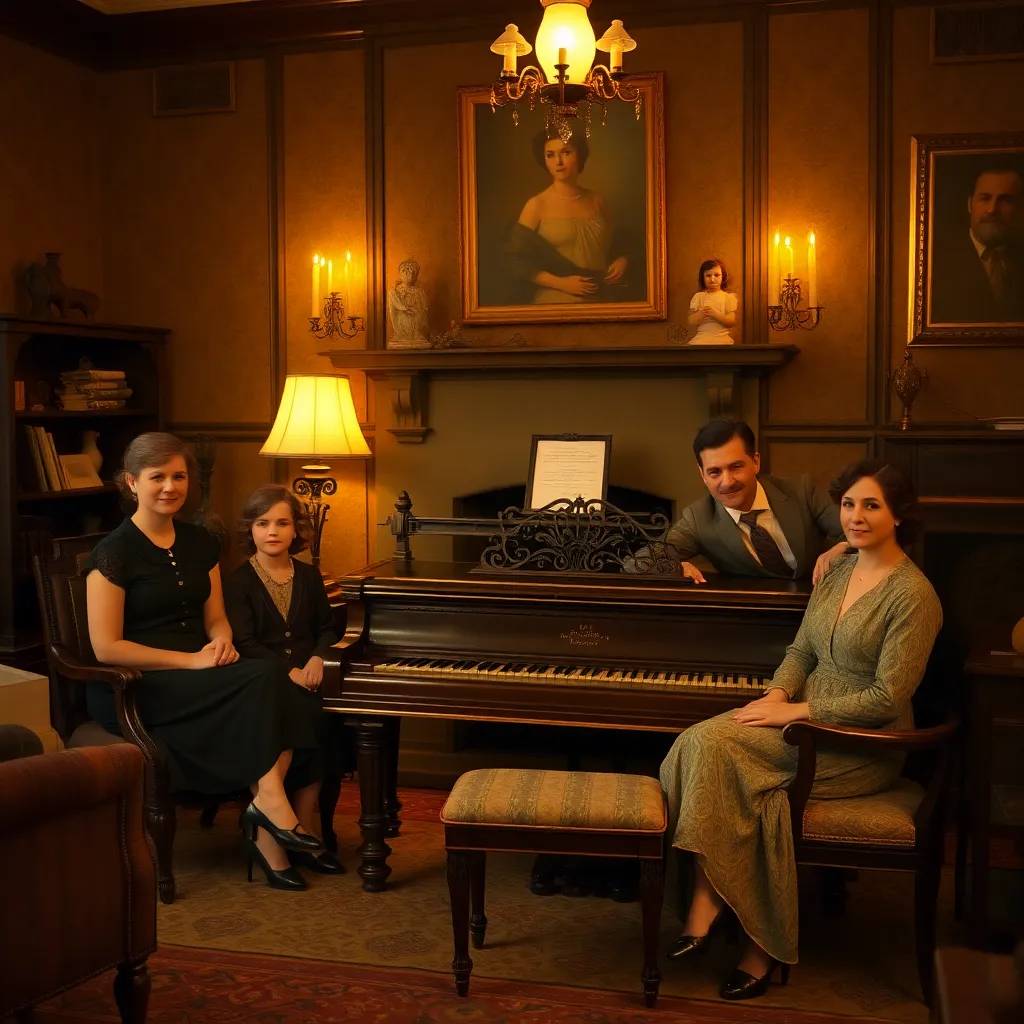 Revive the past by animating a vintage family portrait. The scene is set in a cozy living room, circa 1920s. The subjects, dressed in their finest attire, are gathered around a piano. The grandmother, a skilled pianist, is about to play a lively tune, bringing joy to her loved ones. Create a captivating animation that brings this nostalgic moment to life.