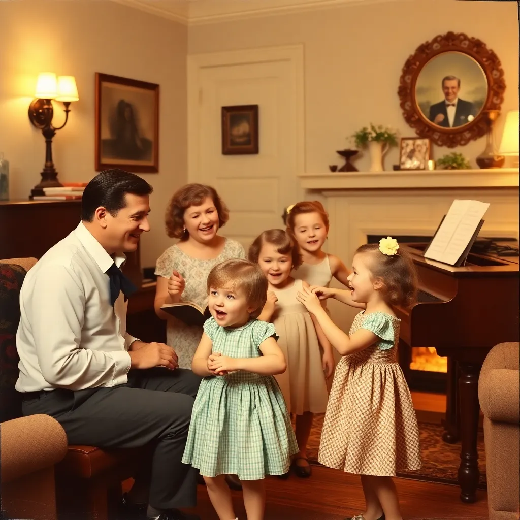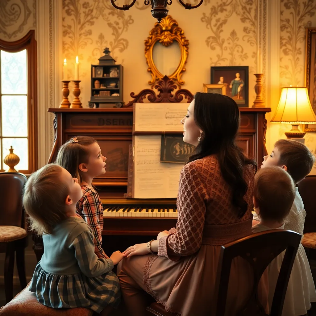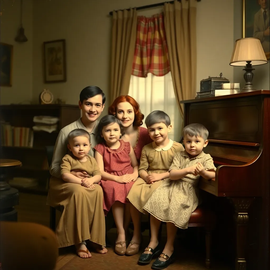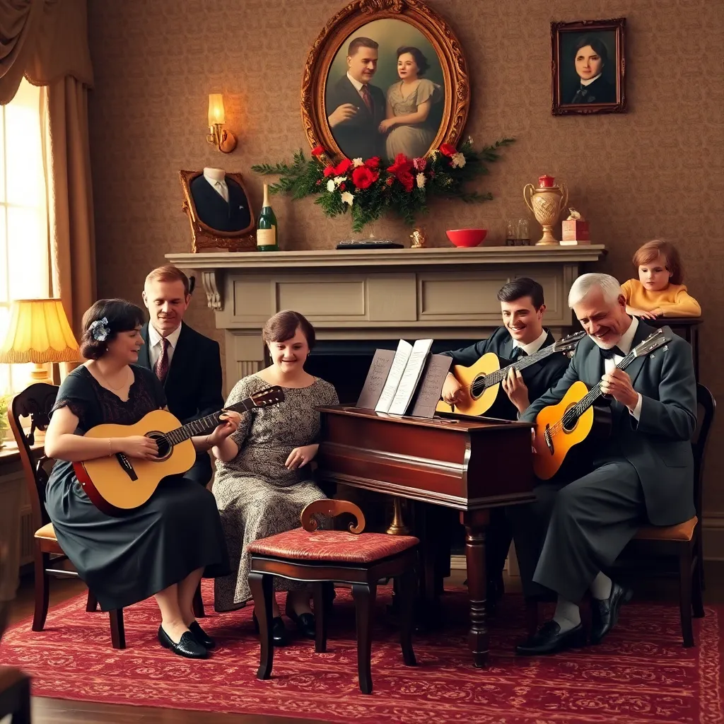 Revive the past by animating a vintage family portrait. The scene is set in a cozy living room, circa 1920s. The subjects, dressed in their finest attire, are gathered around a piano. The grandmother, a skilled pianist, is about to play a lively tune, bringing joy to her loved ones. Create a captivating animation that brings this nostalgic moment to life.