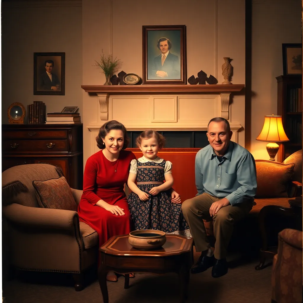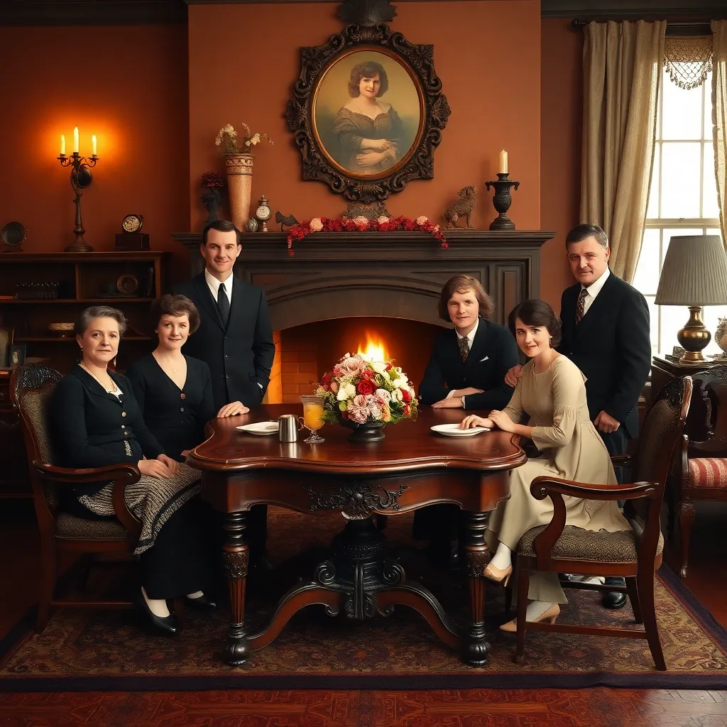 Bring to life a vintage family portrait from the 1920s. The scene takes place in a cozy living room with a warm fireplace. The family is gathered around a ornate wooden table, surrounded by antique furniture and decorations. The atmosphere is nostalgic and inviting, with a hint of warmth and comfort.
