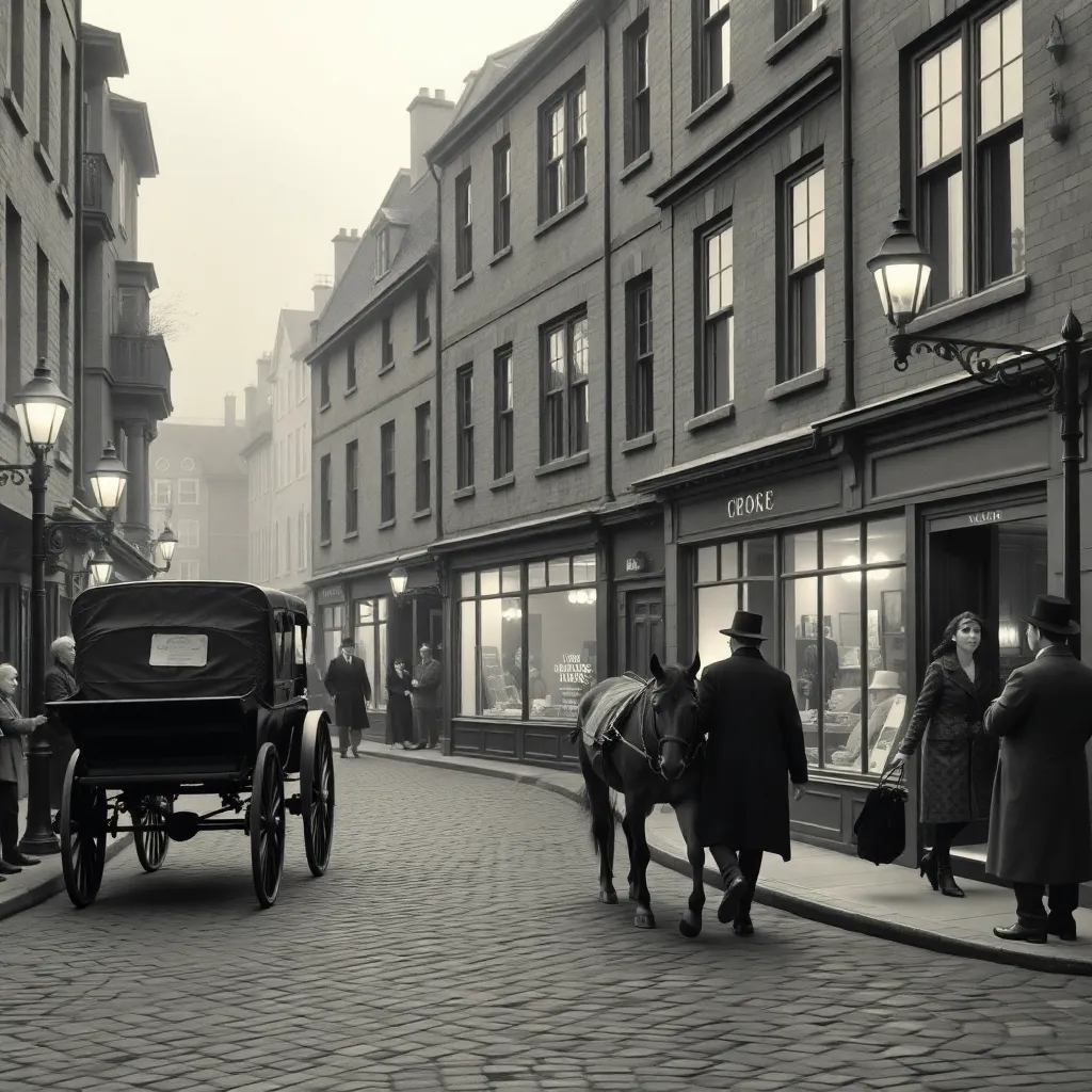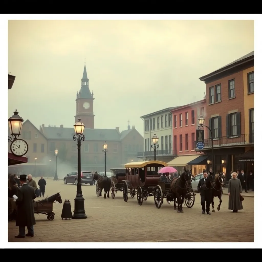 Revive vintage memories! Take a 19th-century photograph of a quaint town square, featuring horse-drawn carriages, old-fashioned street lamps, and people dressed in traditional attire. Add a touch of magic by incorporating a subtle glow, wispy fog, or a hint of steam train smoke to transport viewers to a bygone era.