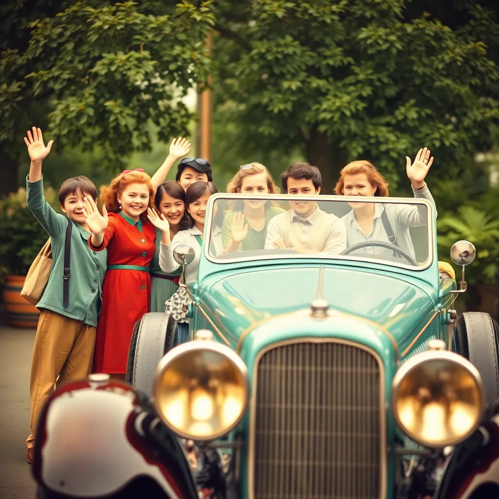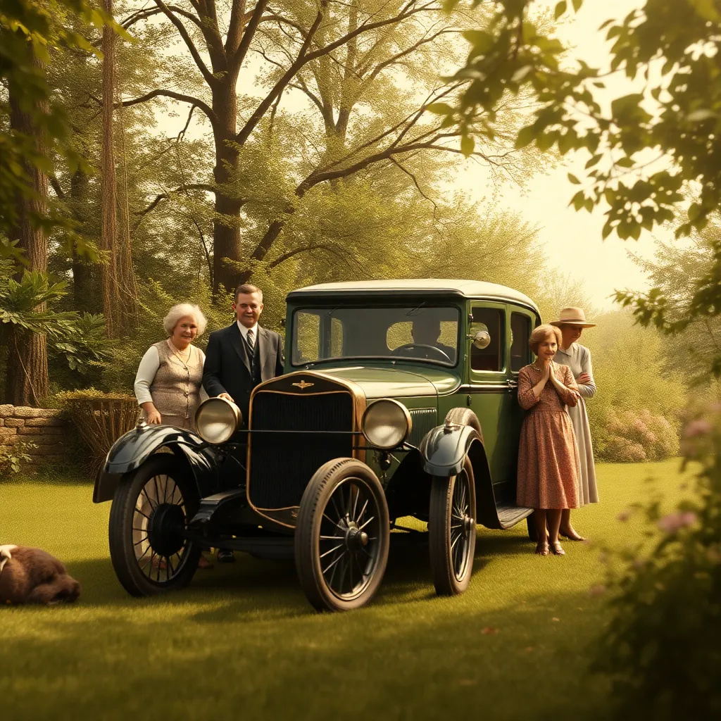 Revive nostalgic memories by animating an old family photo from the 1920s. The image shows a group of people gathered around a vintage car, surrounded by lush greenery. Bring the scene to life by adding subtle movements, sounds, and special effects to create a captivating and heartwarming animation.