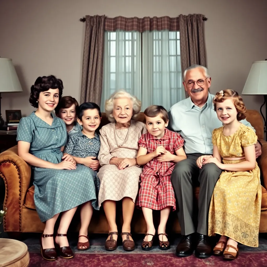 Bring to life a vintage family gathering from the 1950s. An elderly couple, surrounded by children and grandchildren, sit on a worn couch in a cozy living room. The grandmother's warm smile and the grandfather's gentle touch radiate love and nostalgia. Restore the faded colors and add subtle animation.