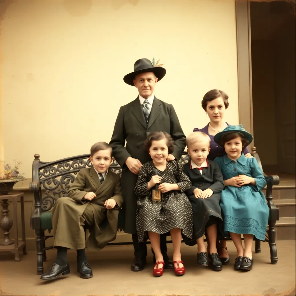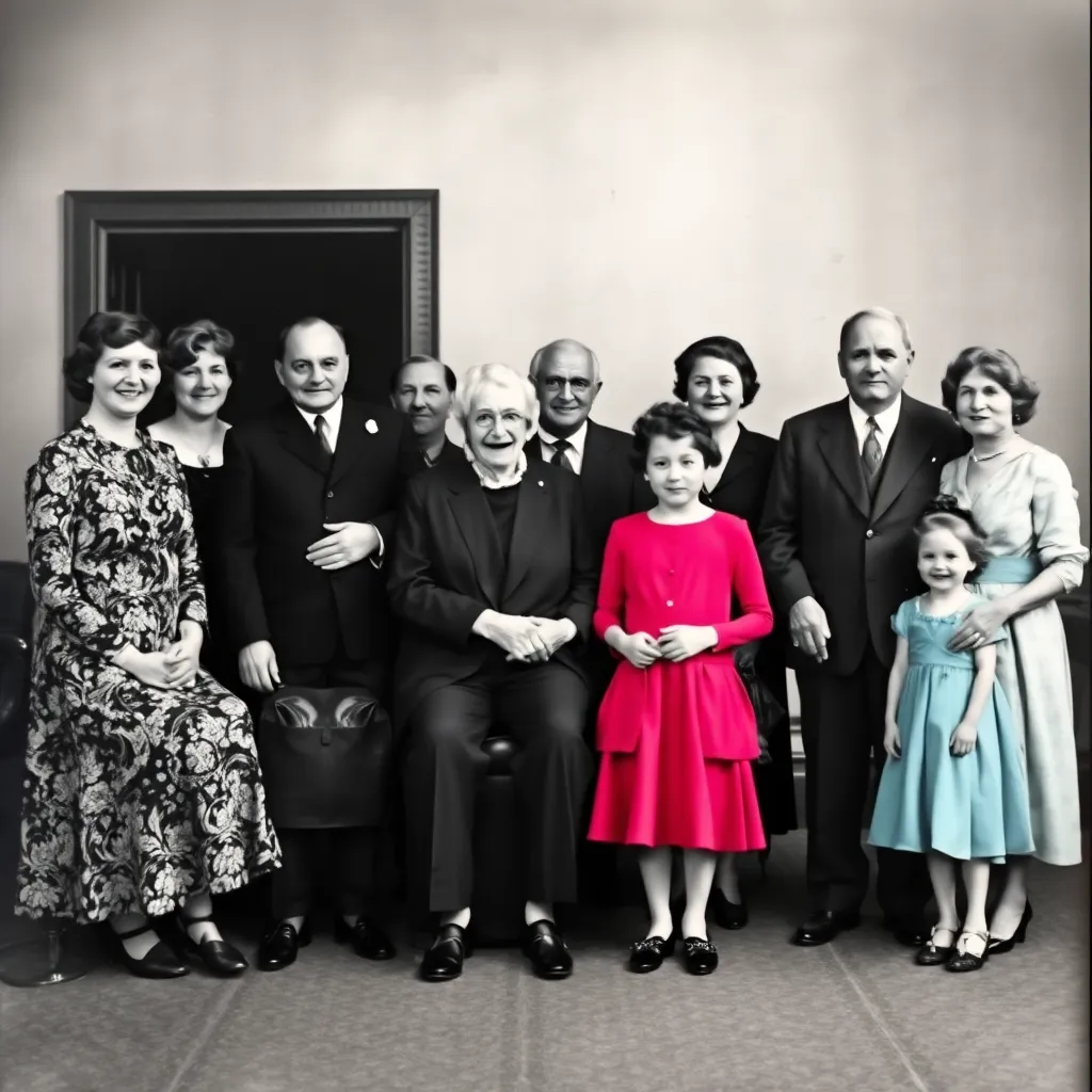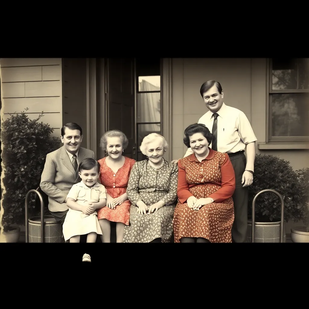 Revive nostalgic memories! Take an old black and white photograph of a family gathering, and bring it to life by adding vibrant colors, textures, and details. Imagine the scene in a modern setting, with updated clothing, accessories, and surroundings. What secrets will the newly animated photo reveal about the past?