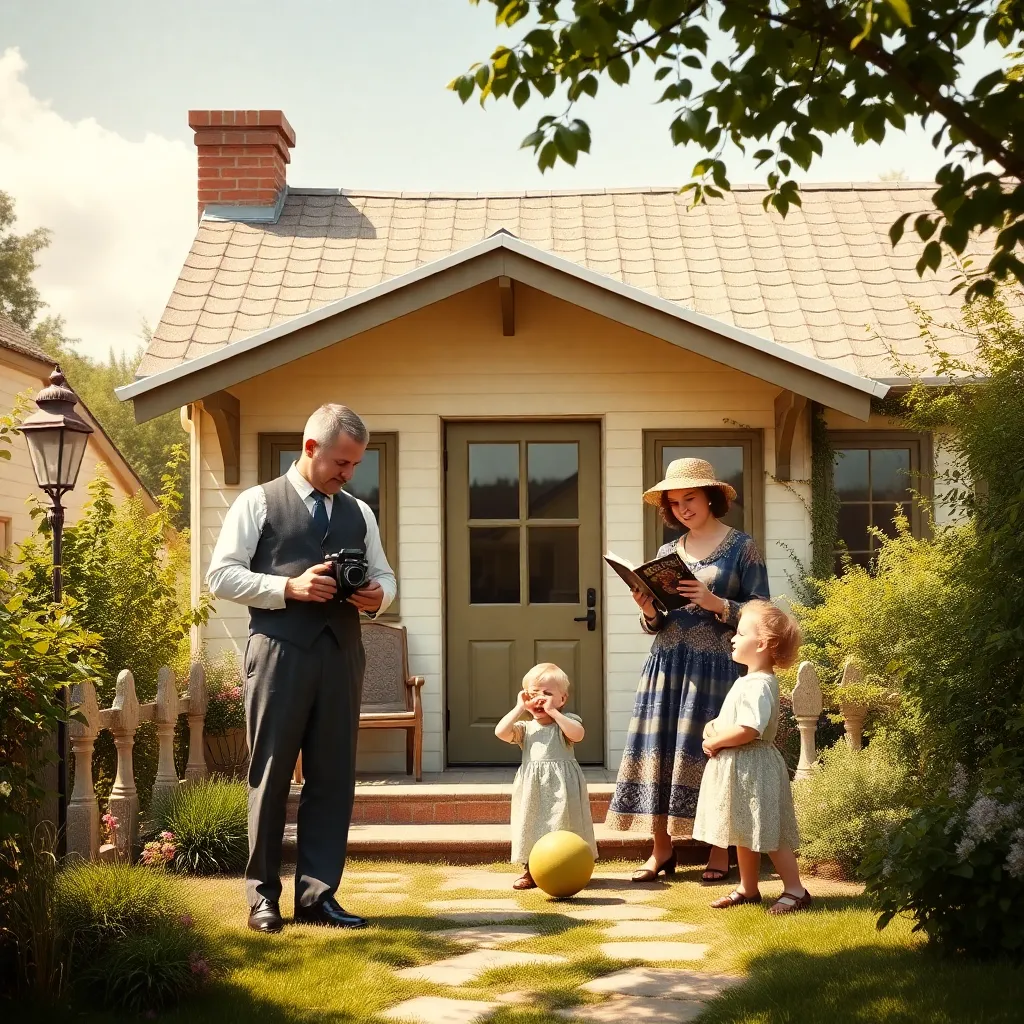 Bring to life a vintage family photo from the 1920s. The scene is set in a quaint small town on a sunny afternoon. The family is gathered outside their cozy cottage, surrounded by lush greenery. The father is holding a vintage camera, the mother is reading a book, and the children are playing with a ball. Add animations and special effects to make the scene come alive.