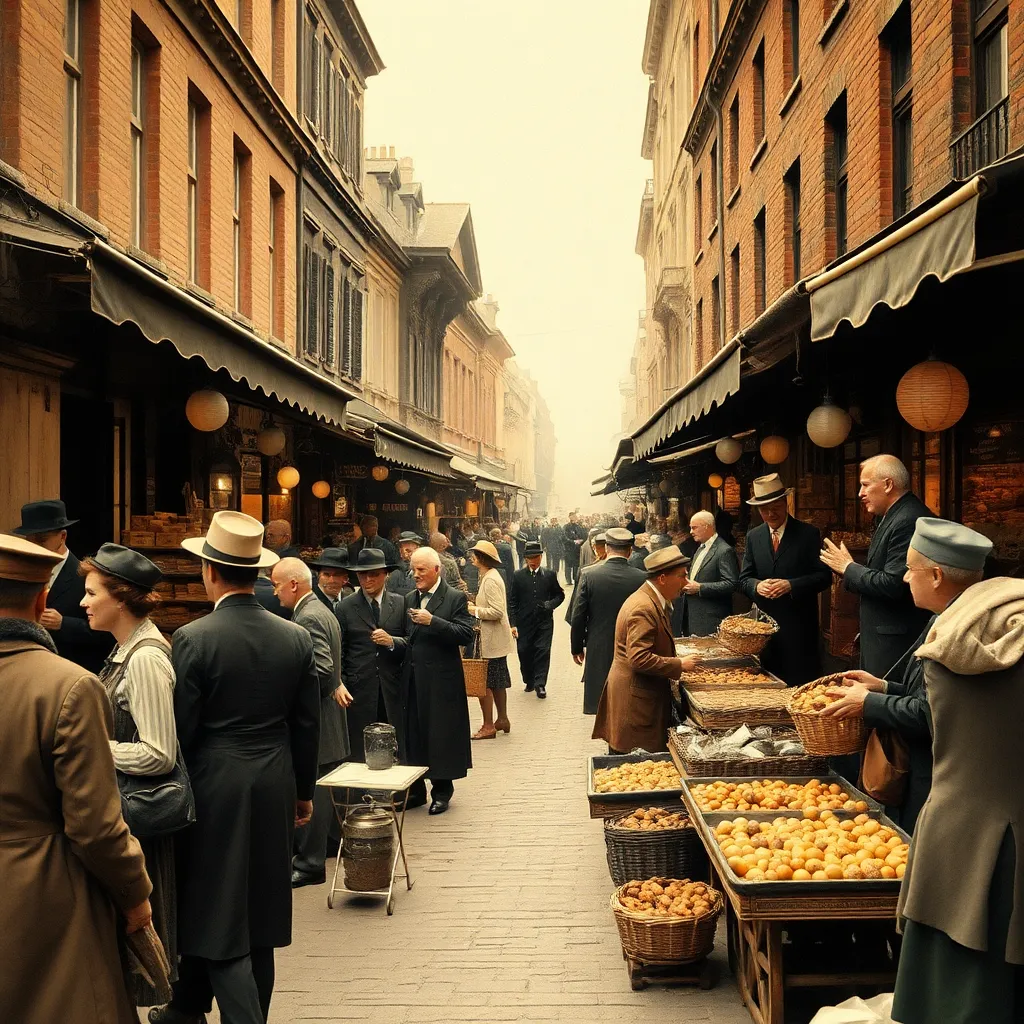 Bring to life a vintage photograph of a bustling street market from the 1920s. Imagine the scene coming alive with movement and sound. Merchants call out to passersby, while vendors expertly juggle their wares. The smell of fresh bread and roasting nuts fills the air, transporting you to a bygone era.