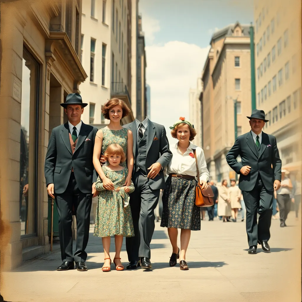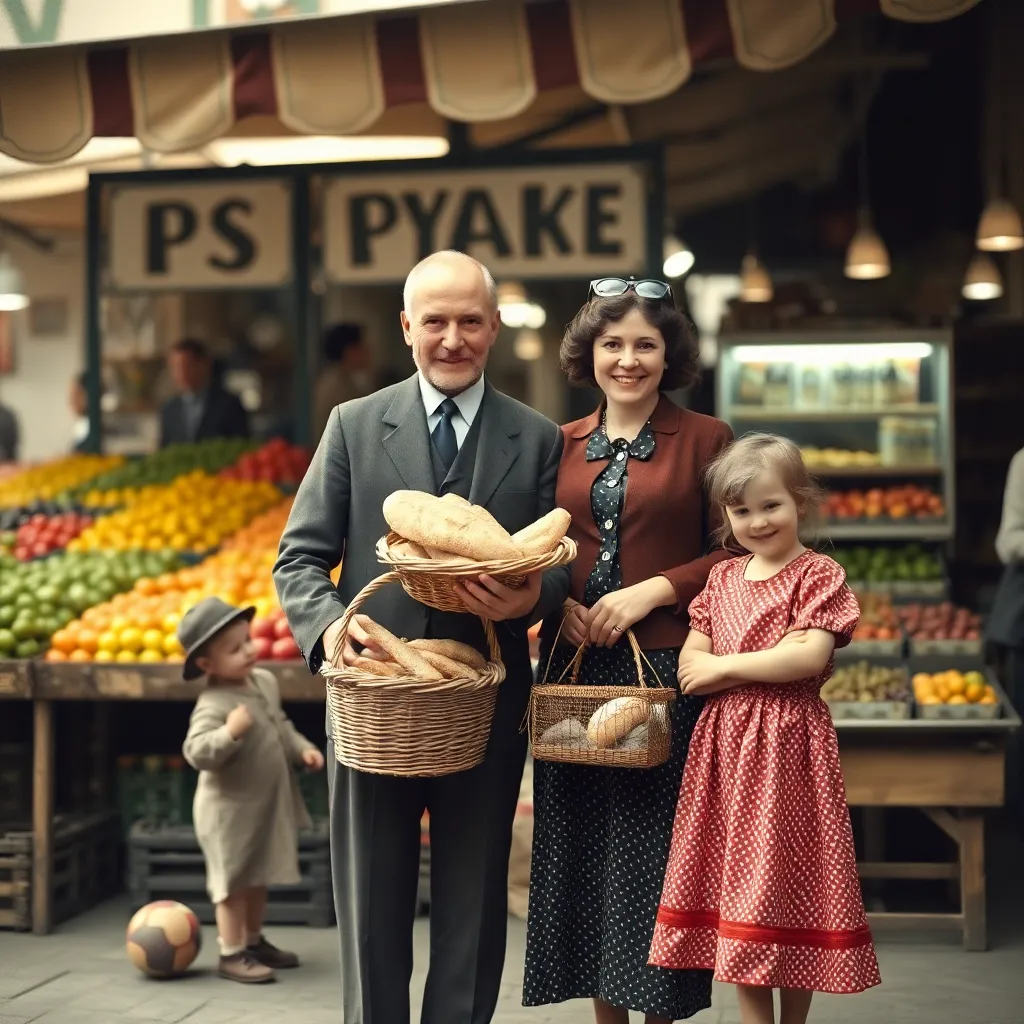 Bring to life a vintage family photo from the 1920s. The scene is set in a bustling street market, with the family standing in front of a colorful fruit stand. The father is holding a basket of fresh bread, while the mother is smiling at the camera. The children are playing with a ball in the background.